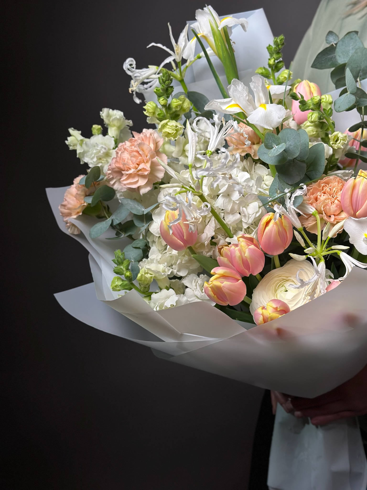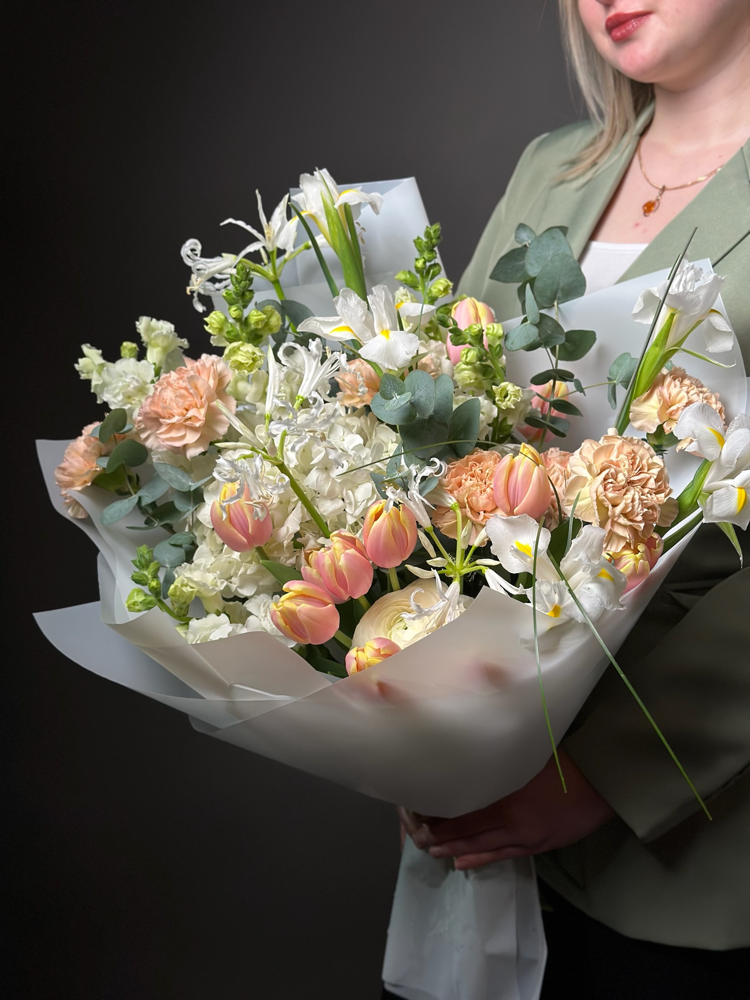 «Палитра весны» от бренда «Цветы Луны» — это идеальный подарок для близких и знакомых по любому поводу! Будничный день станет ярче рядом с мамой, любимой девушкой, женщиной-коллегой или учителем, а праздничный обретет особую атмосферу вместе с этим уникальным авторским букетом из антириума, самшита, неринеи, тюльпанов, берграса, ирисов, эвкалипта, гортензий и ранункулусов. Элегантное оформление в декоративной пленке и банте подчеркнет индивидуальность вашего подарка.