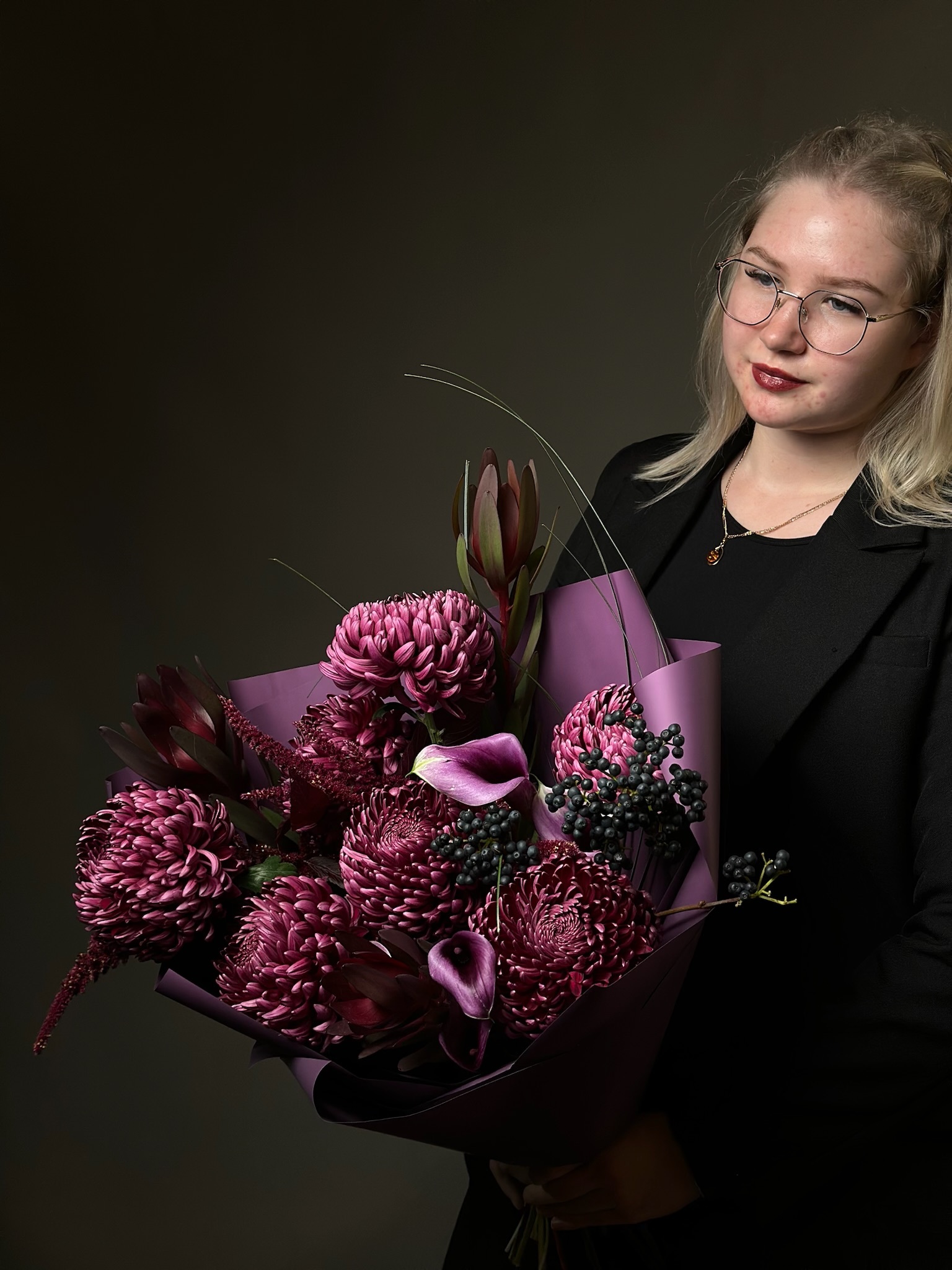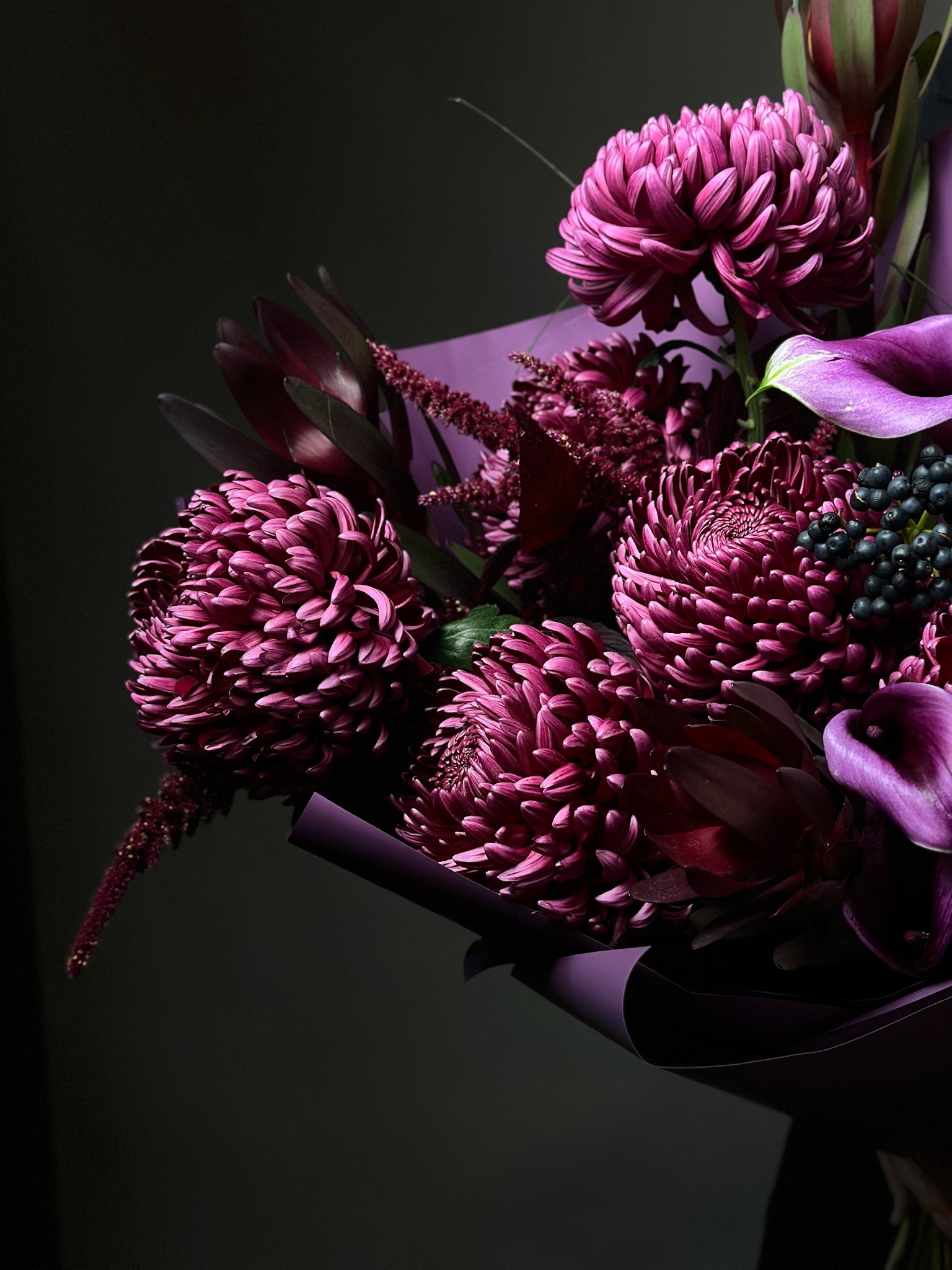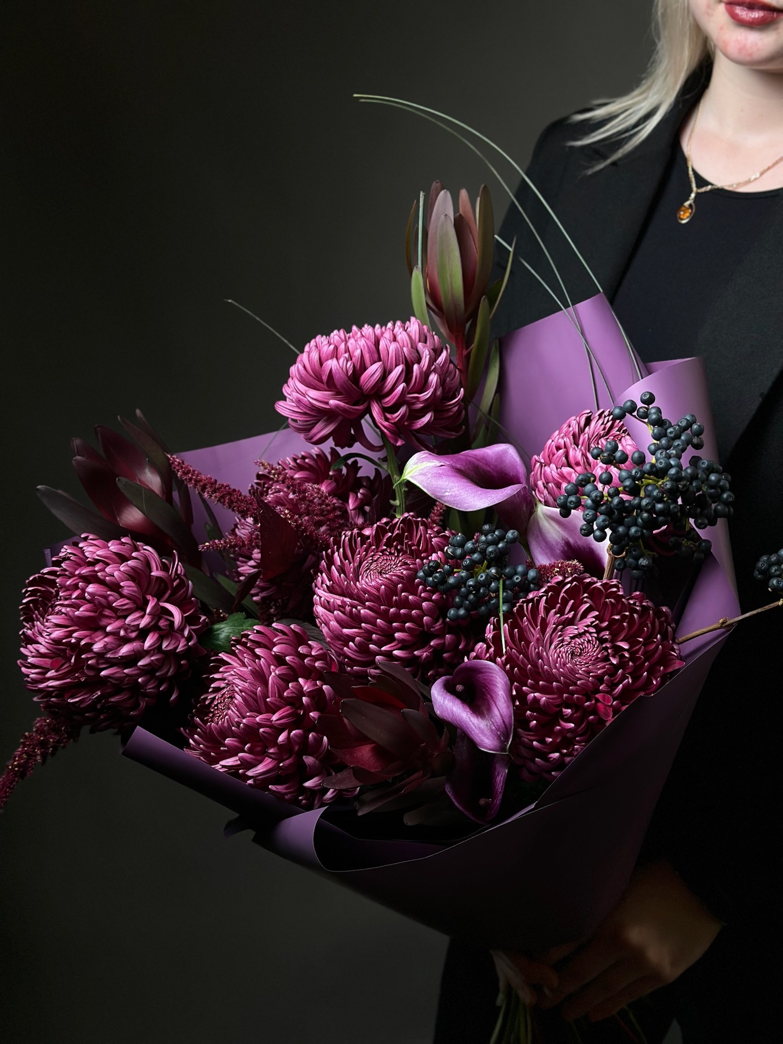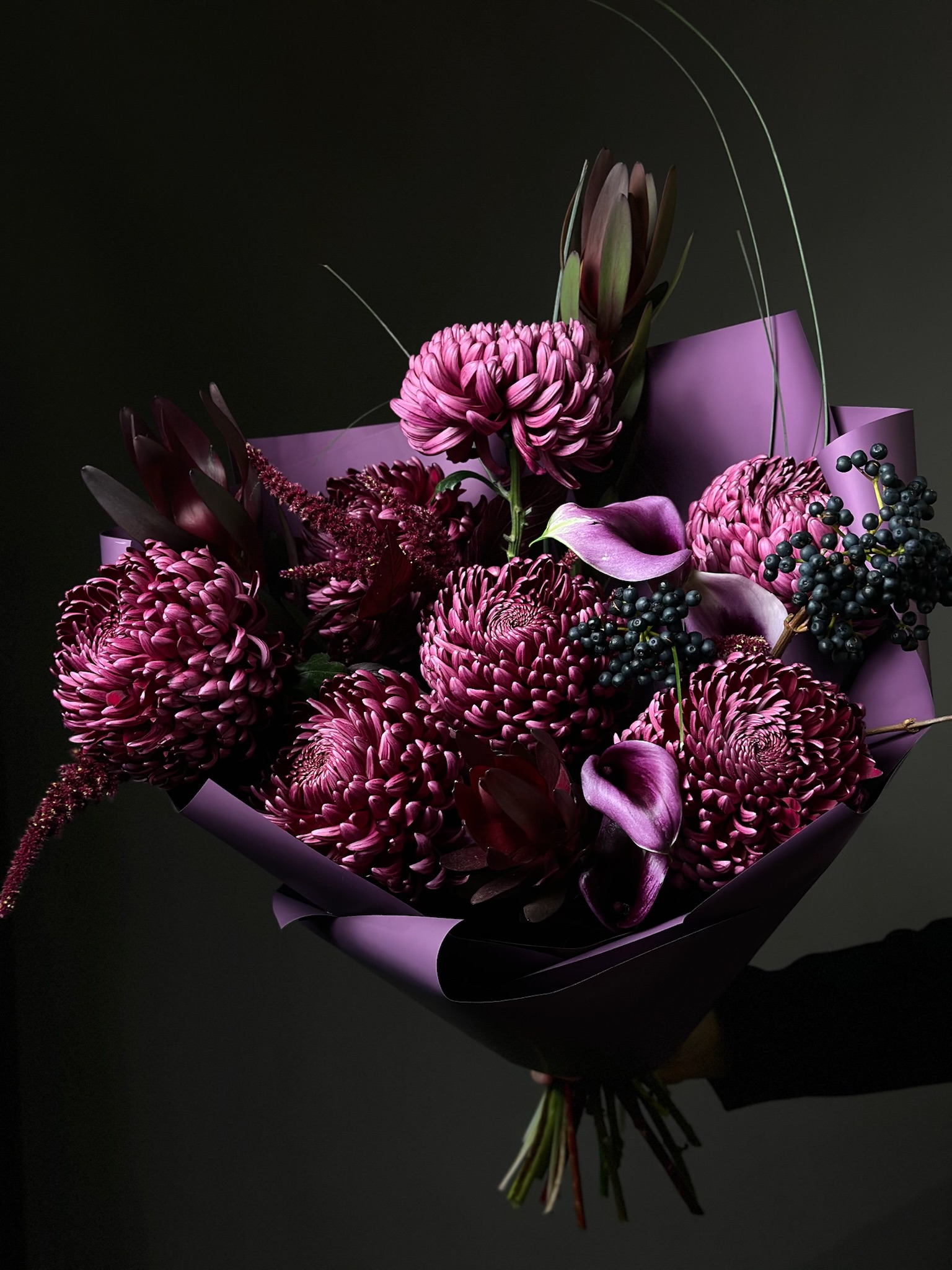 Откройте для себя эксклюзивность и элегантность нашего нового авторского букета «Пурпурный танец» от бренда "Цветы Луны"! Подчеркните индивидуальность подарка, выбрав композицию из уникальных хризантем-бигуди, калл, левкадендрона, амаранта и вибурнум – идеально подойдет как для мамы, так и для коллеги, мужчины или женщины. Любые поводы – от Дня Святого Валентина до Нового года мы охватываем! Наш магазин в Саратове предлагает быструю доставку курьером по городу. Позвольте нашим свежим цветам стать вашим главным подарком!