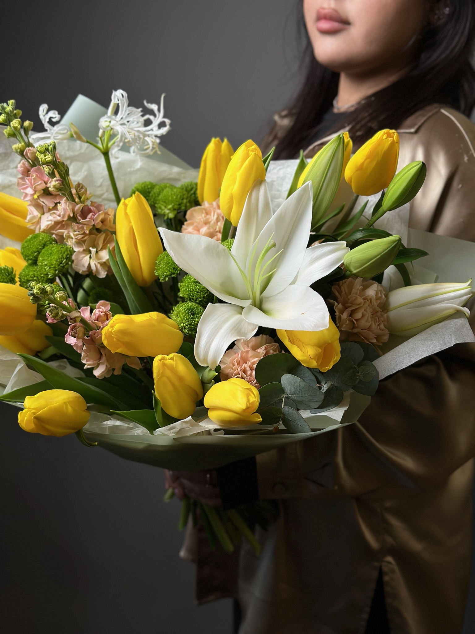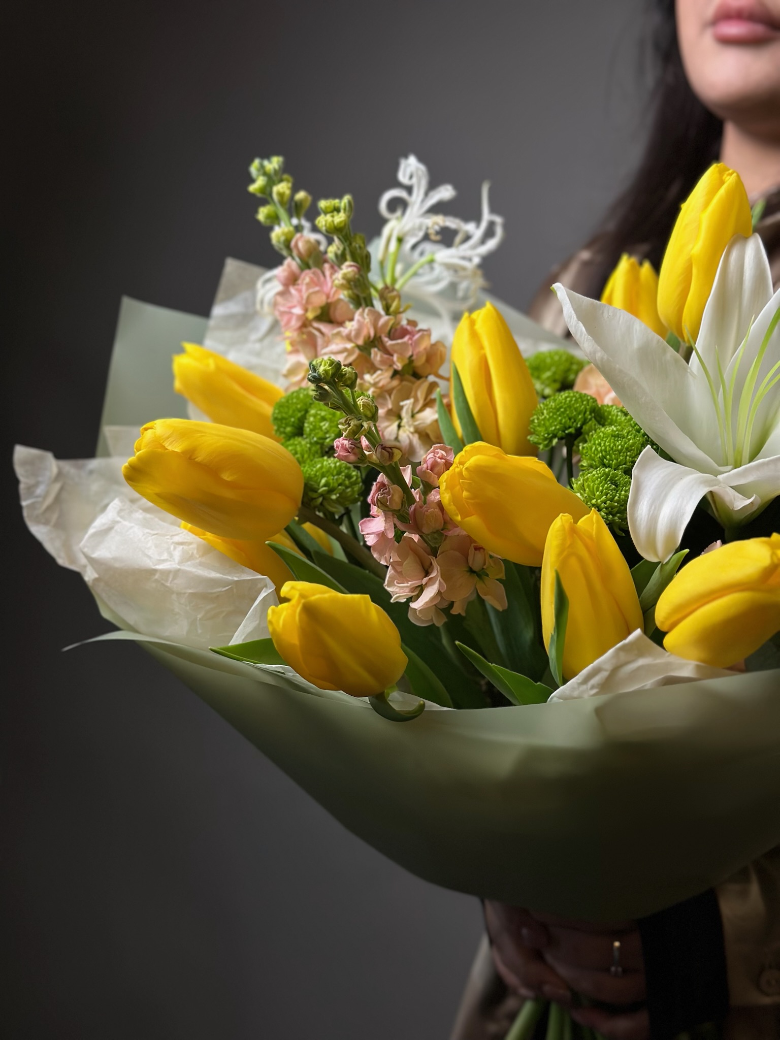 хризантемы, тюльпаны, гвоздики, лилии, маттиола, самшит