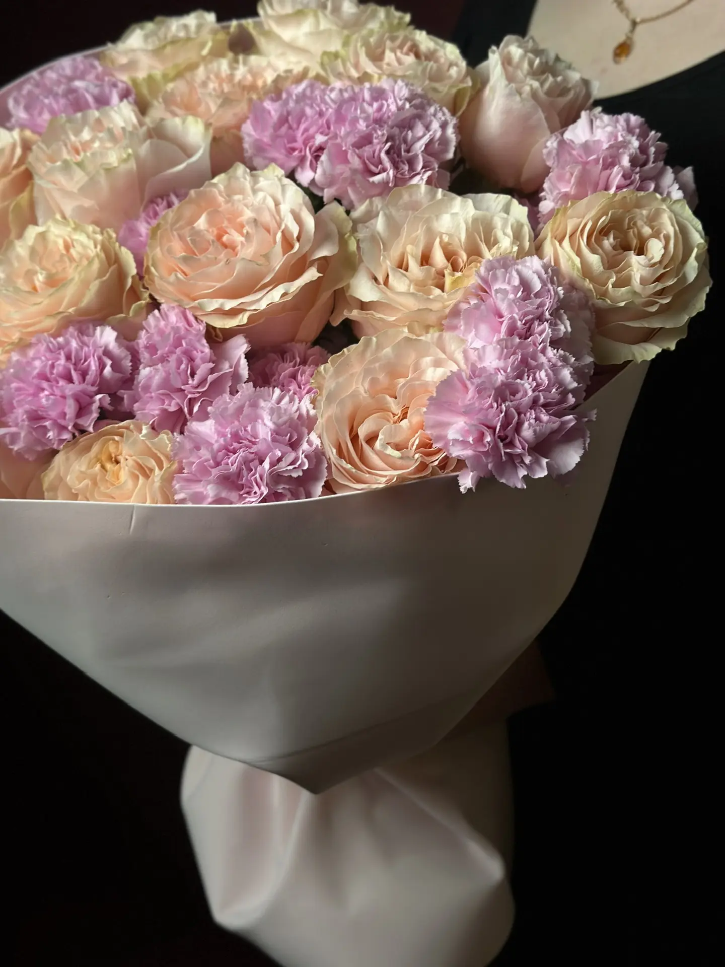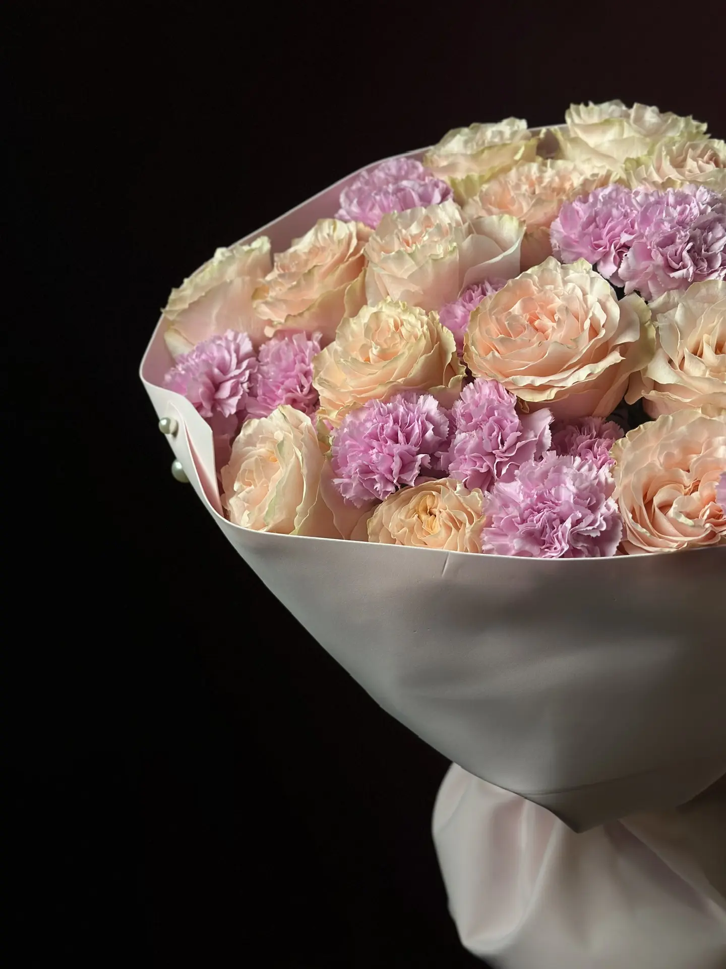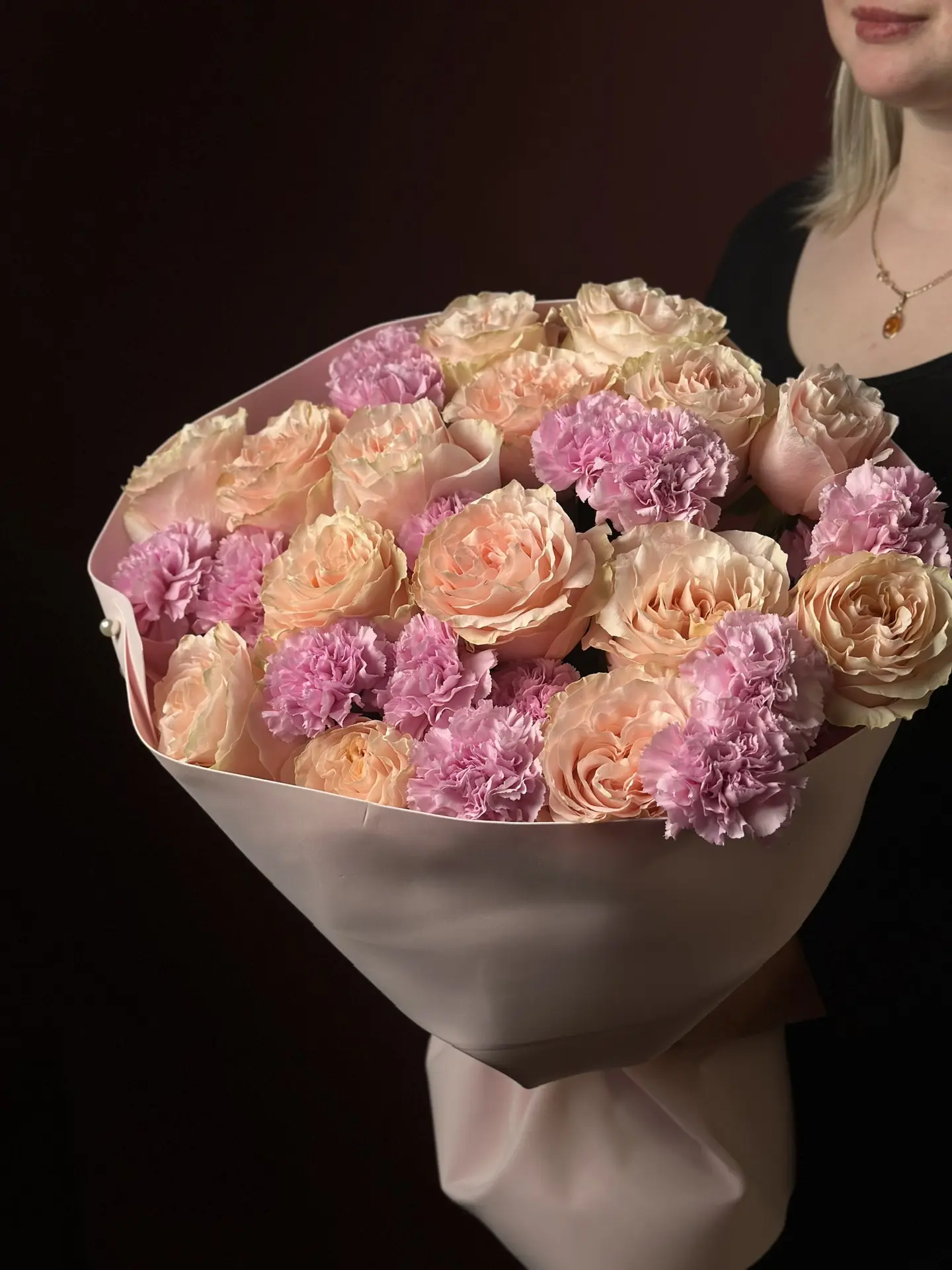 Идеально подойдёт маме, любимой, коллегам, партнёрам, учителям, друзьям и даже детям. Роскошные розы и изящные диантусы оформлены бантом и декоративной плёнкой — каждая деталь подчёркивает вашу заботу о близких.