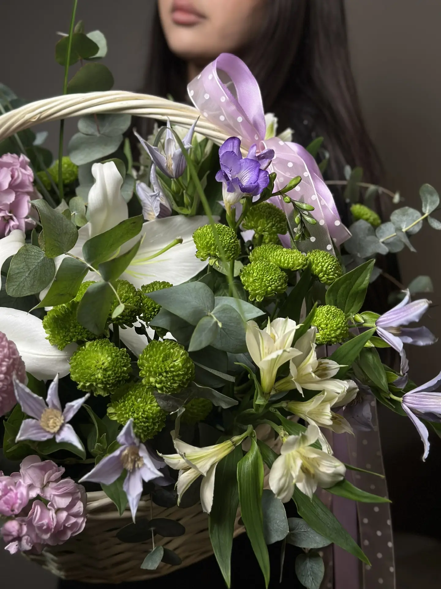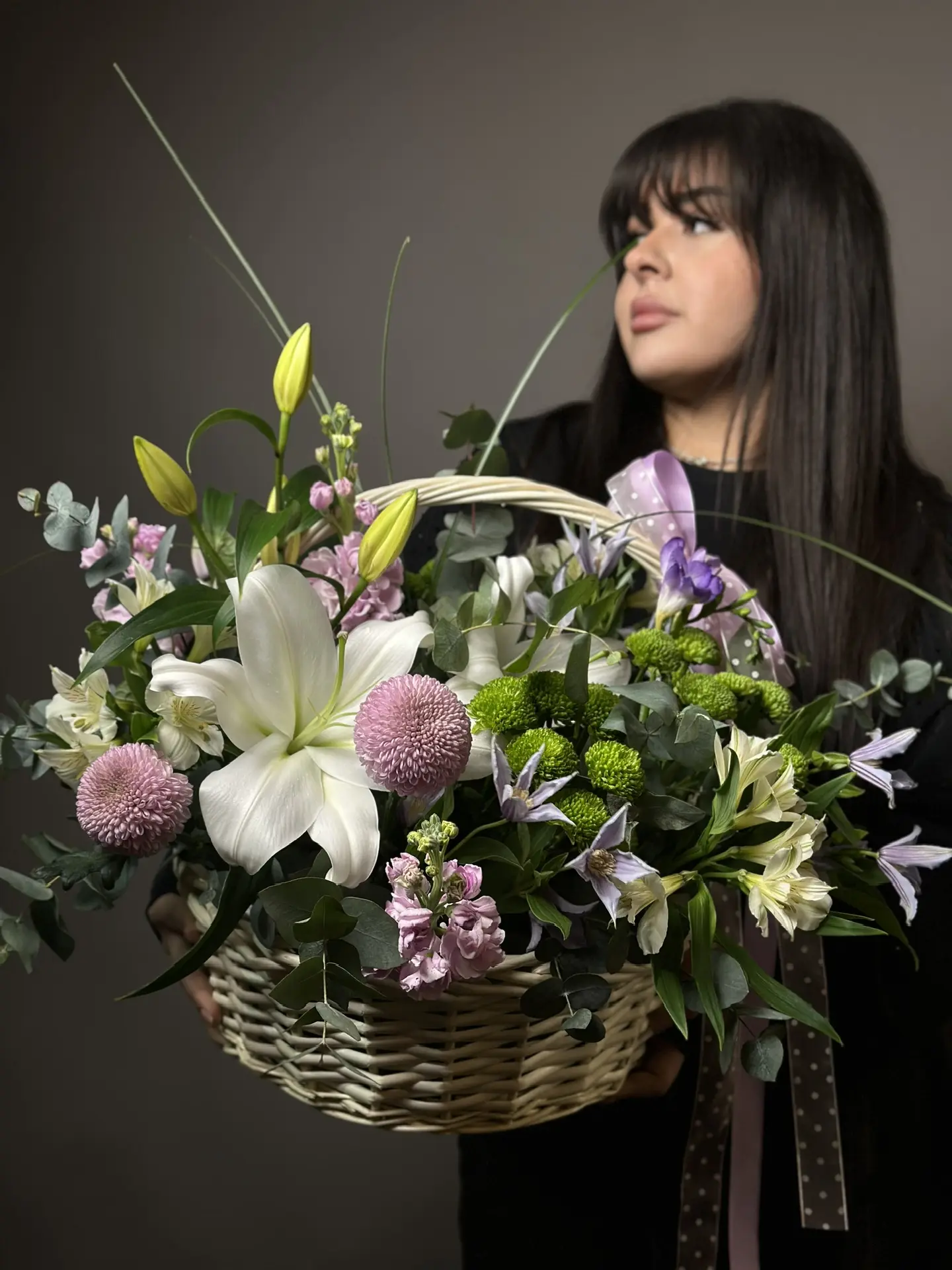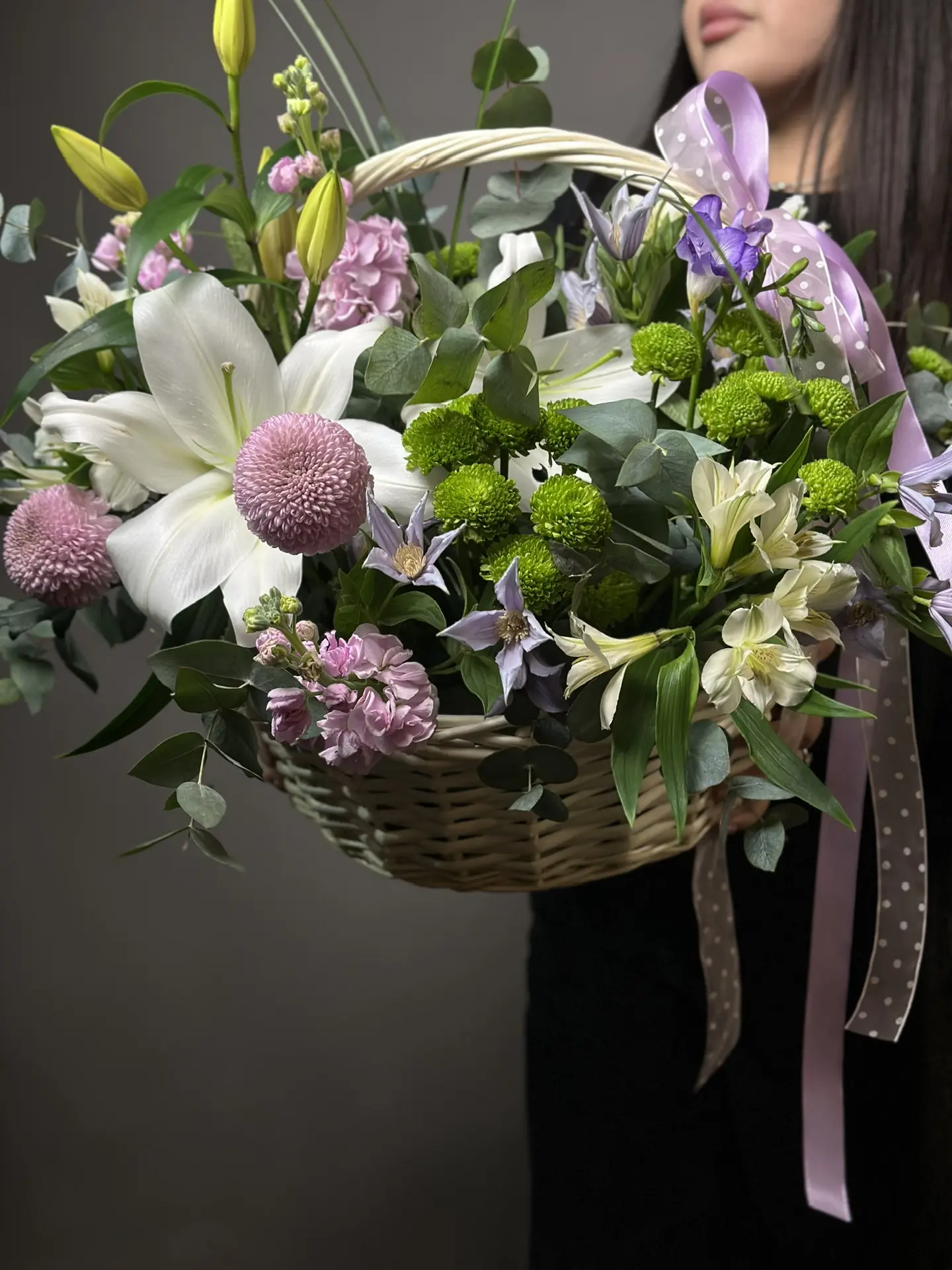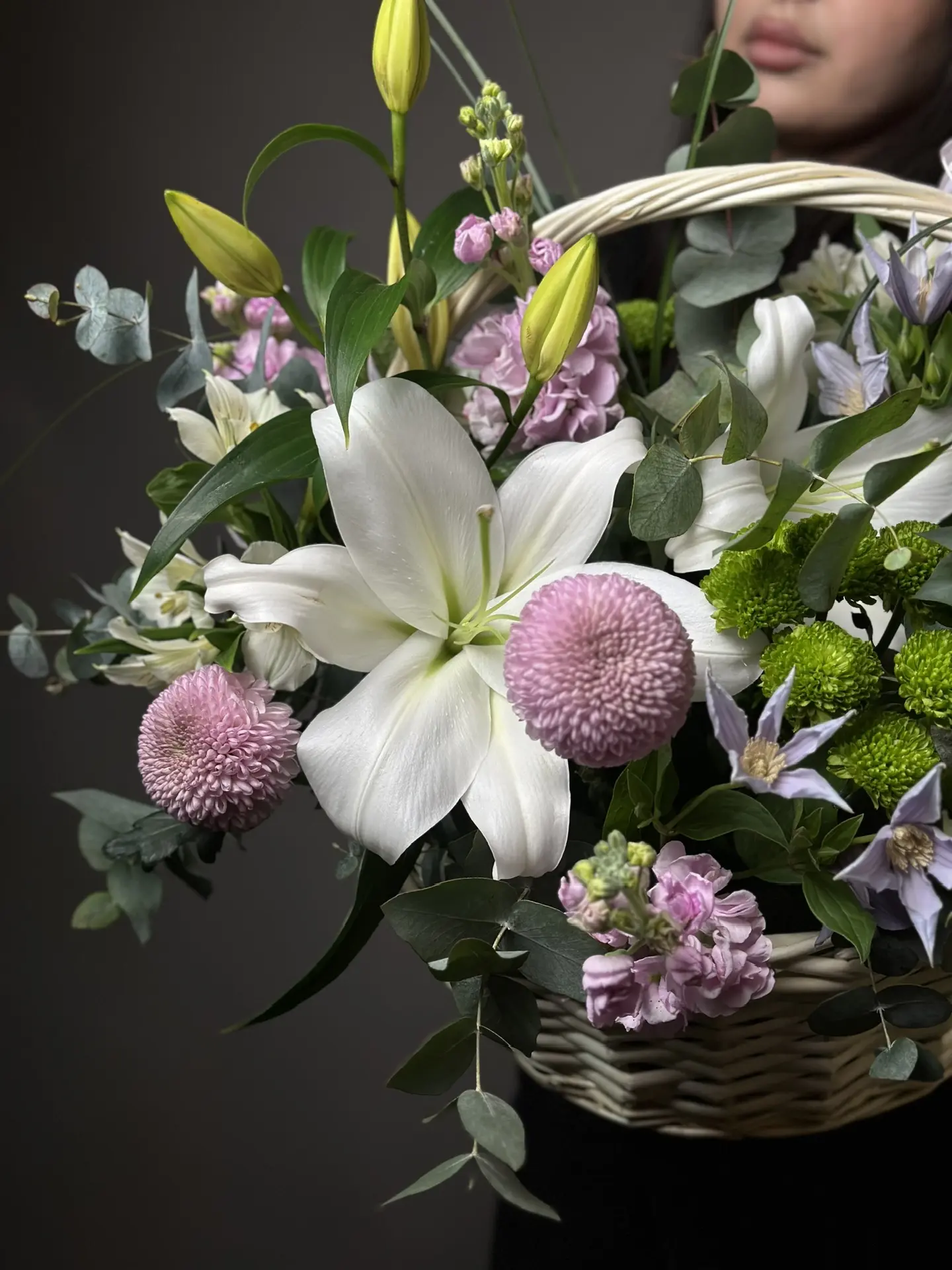 Эта сборная корзина — как тёплый вечер в кругу семьи. Нежные лилии, воздушные хризантемы Момоко, изящные альстромерии, душистая маттиола, утончённый клематис и освежающий эвкалипт собраны в уютную плетёную корзину. Каждый цветок здесь дышит заботой.