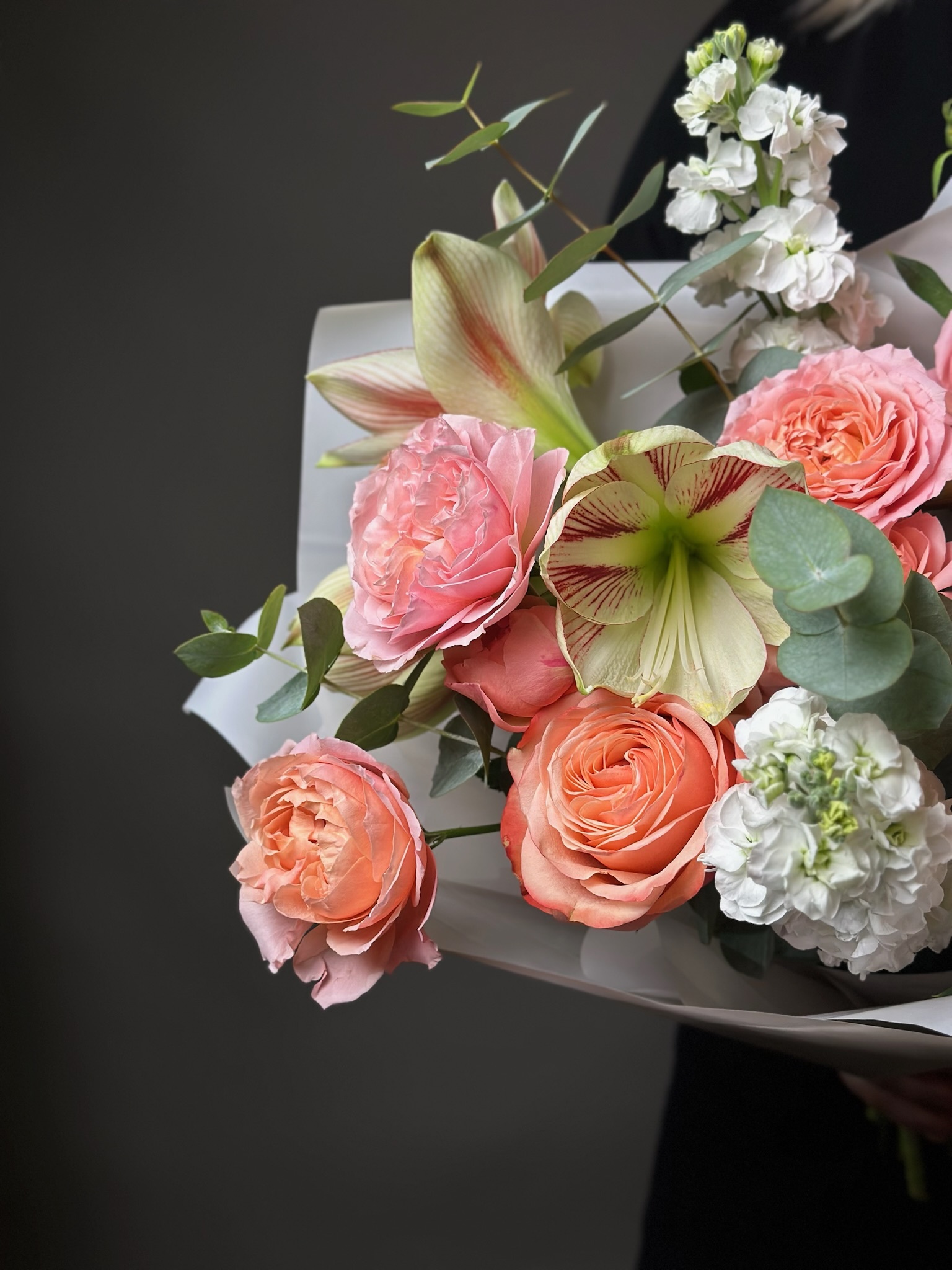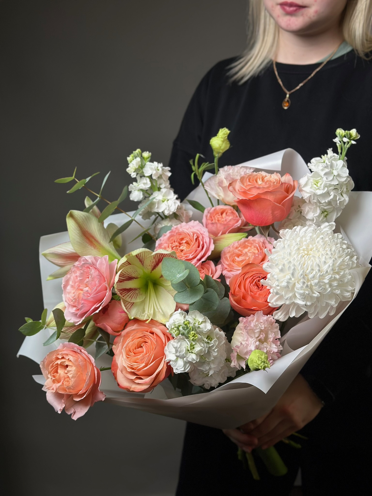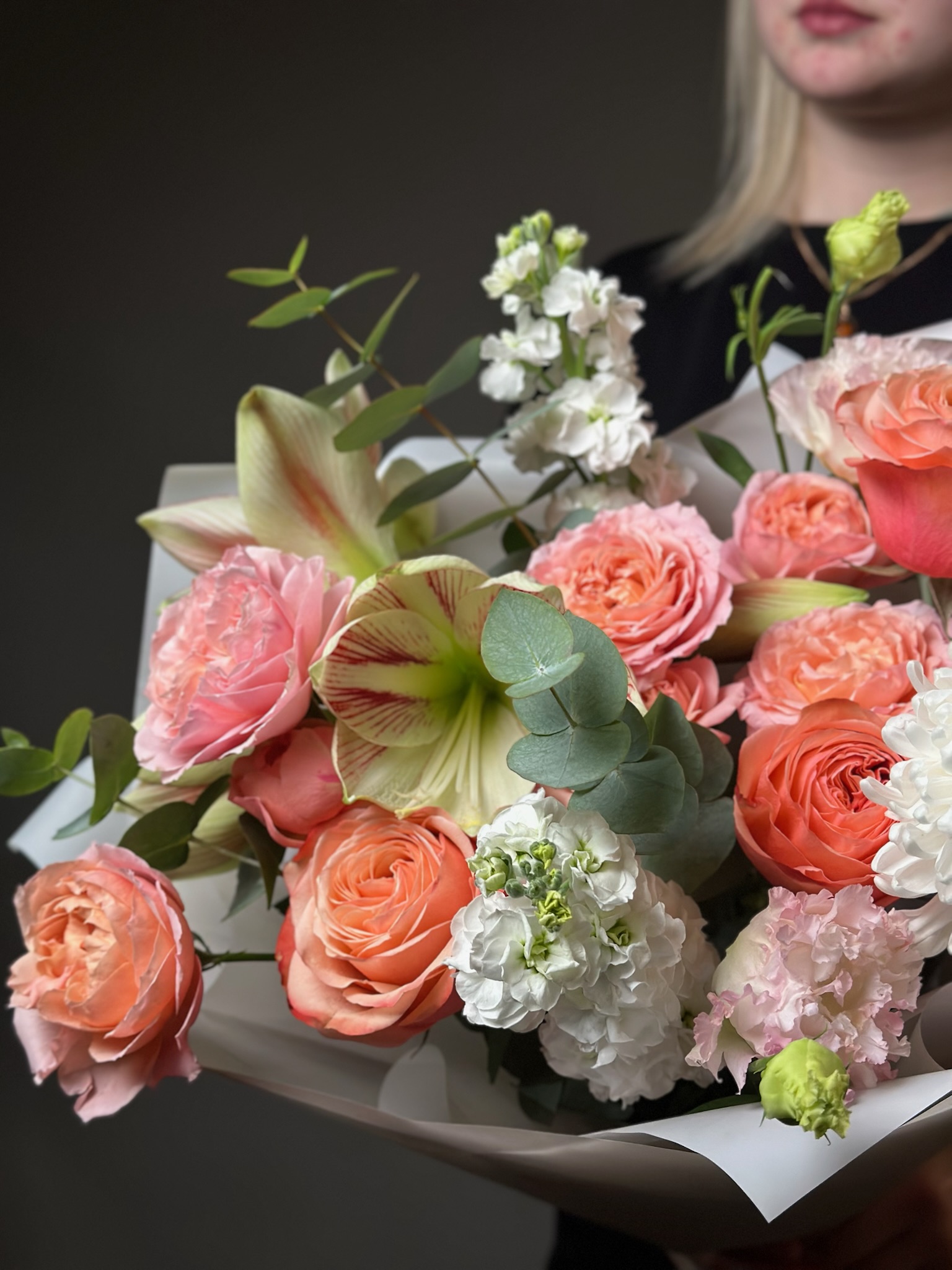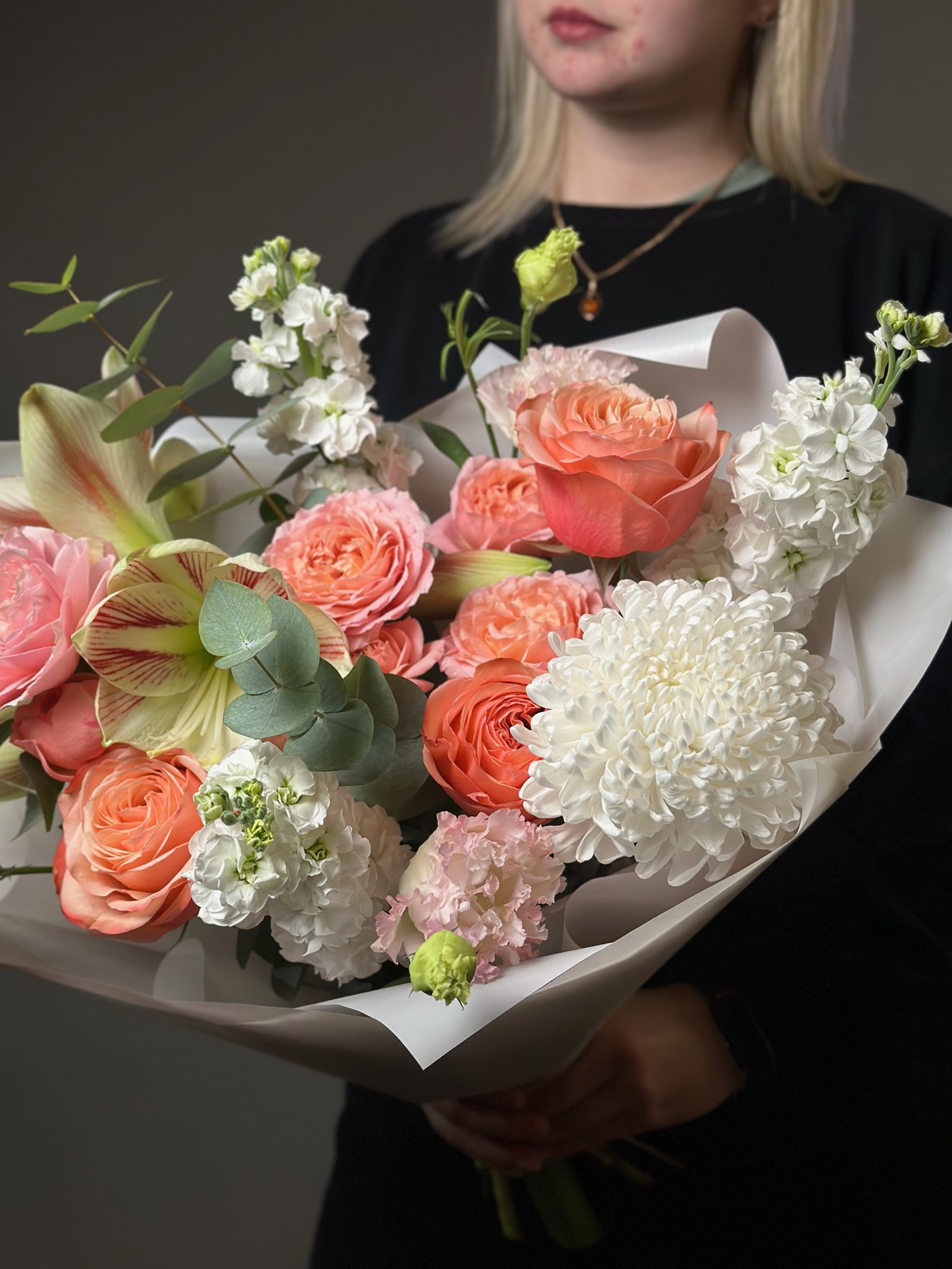 Букет «Ароматная симфония» от бренда «Цветы Луны» – идеальный подарок для мамы, любимой, коллеги, партнера или друга! Амариллисы, эвкалипт, маттиола, эустома и хризантемы создают неповторимую композицию, подходящую к любому празднику (День Рождения, Юбилей, свадьба, 8 марта, День Победы). Доставка свежих цветов по Саратову быстро выполнит наш надежный курьер. Купить стильный букет недорого можно прямо сейчас в нашем магазине!