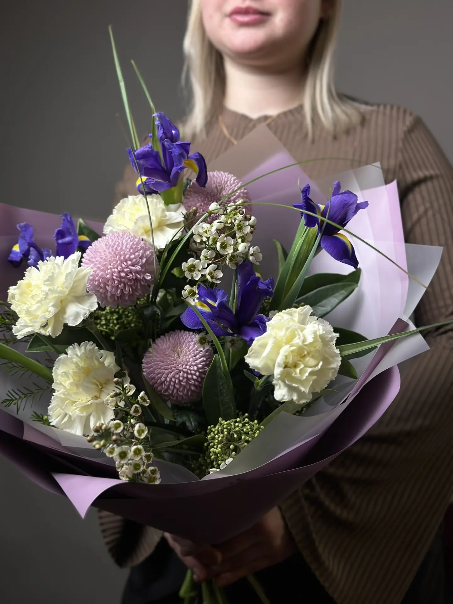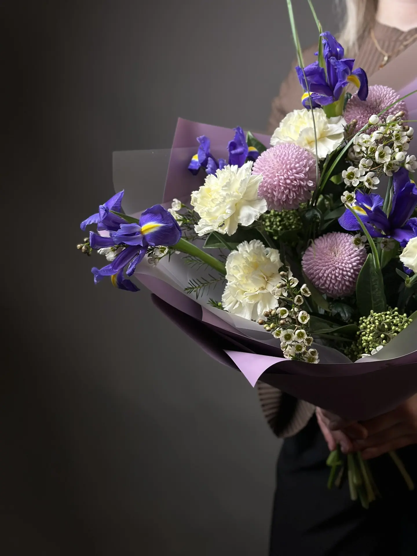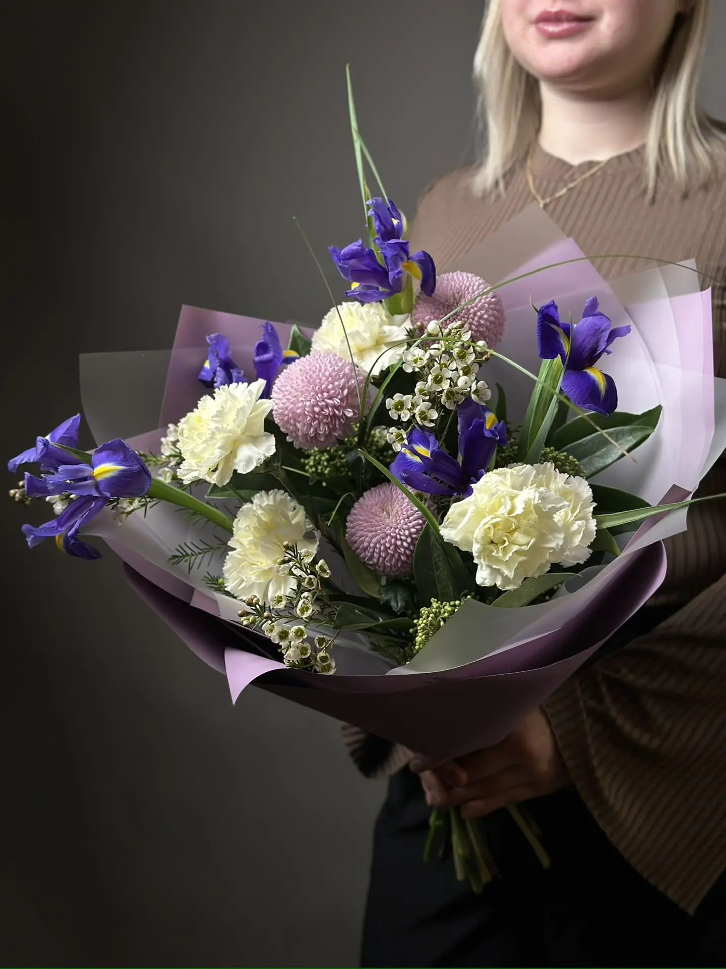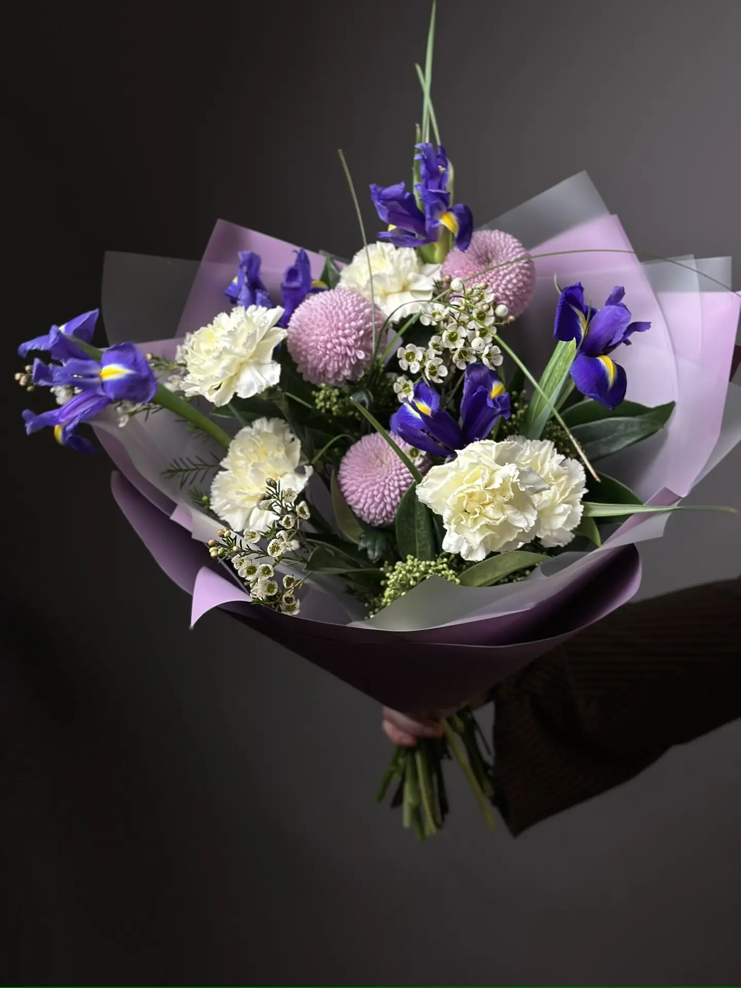 Букет «Дыхание Луны» от бренда «Цветы Луны» — это универсальное решение для любого праздника! Подойдет как маме, любимому человеку, так и деловой партнёрше, учителю, друзьям и даже детям. Гвоздики, хризантемы Момоко, хамелаункумы и ирисы оформлены бантом и декоративной пленкой – такой подарок порадует женщину или мужчину по случаю Дня Рождения, юбилея, Нового года, 14 Февраля, 8 марта и других праздников. Прекрасное сочетание свежести и элегантности!