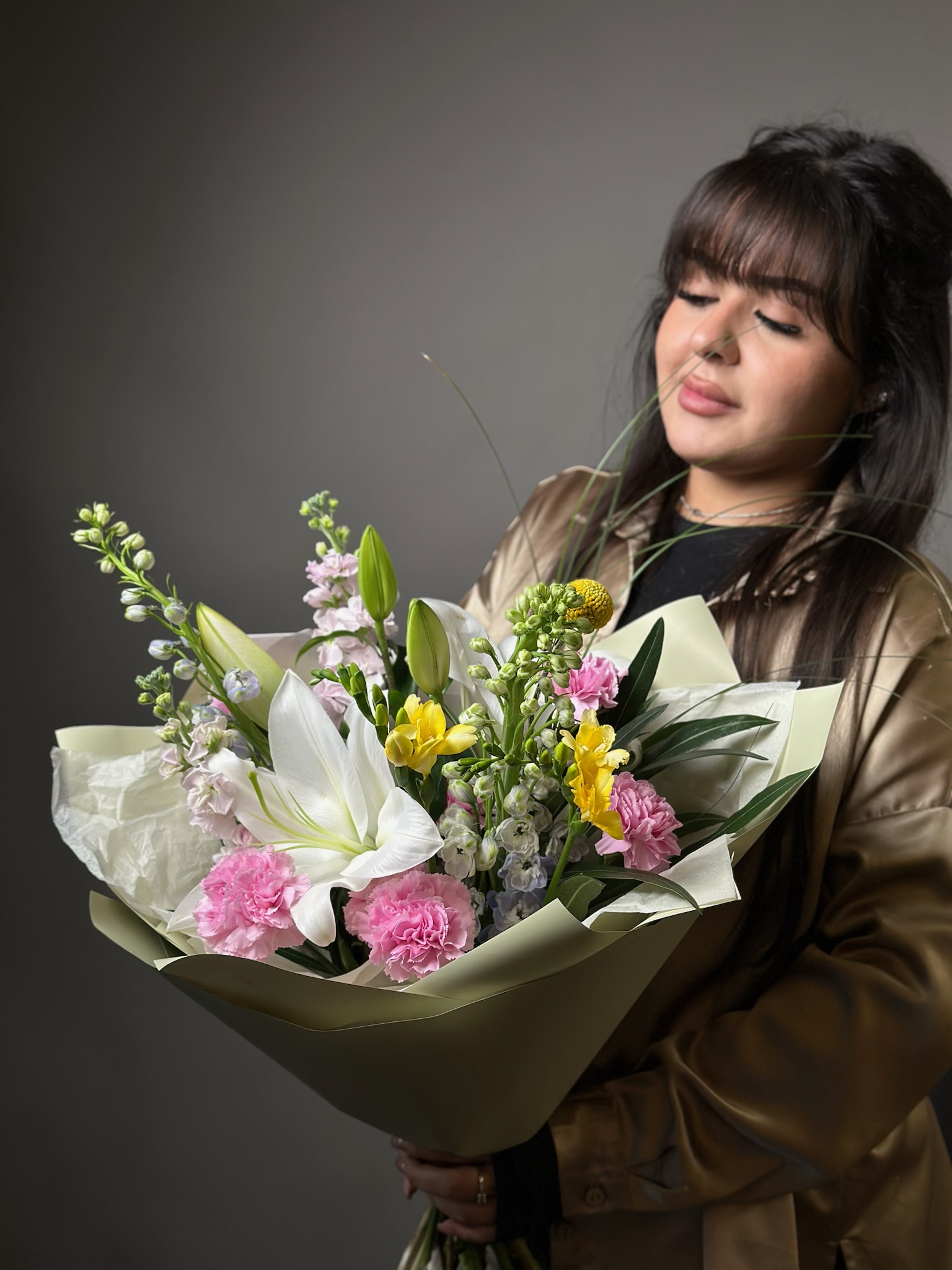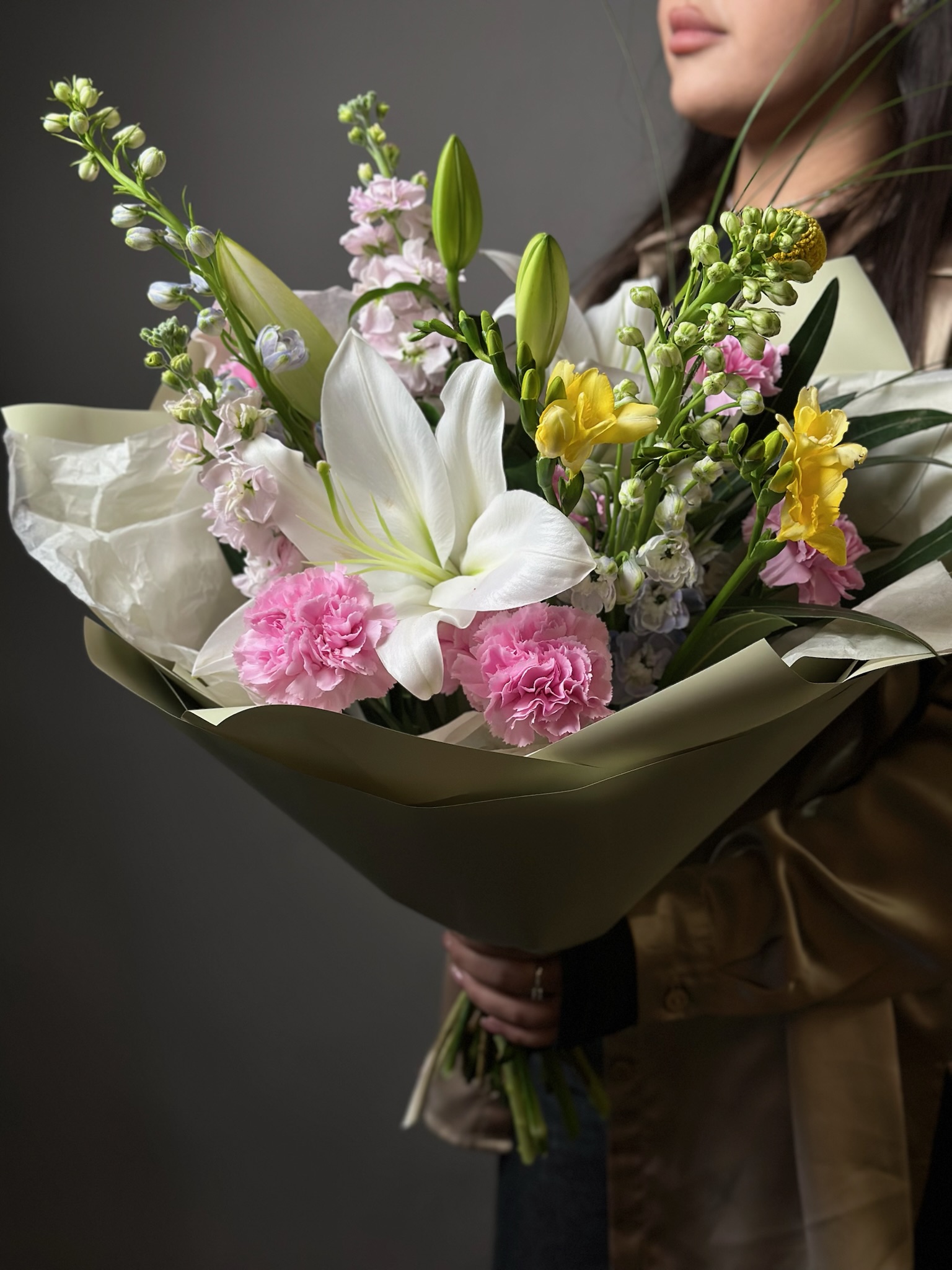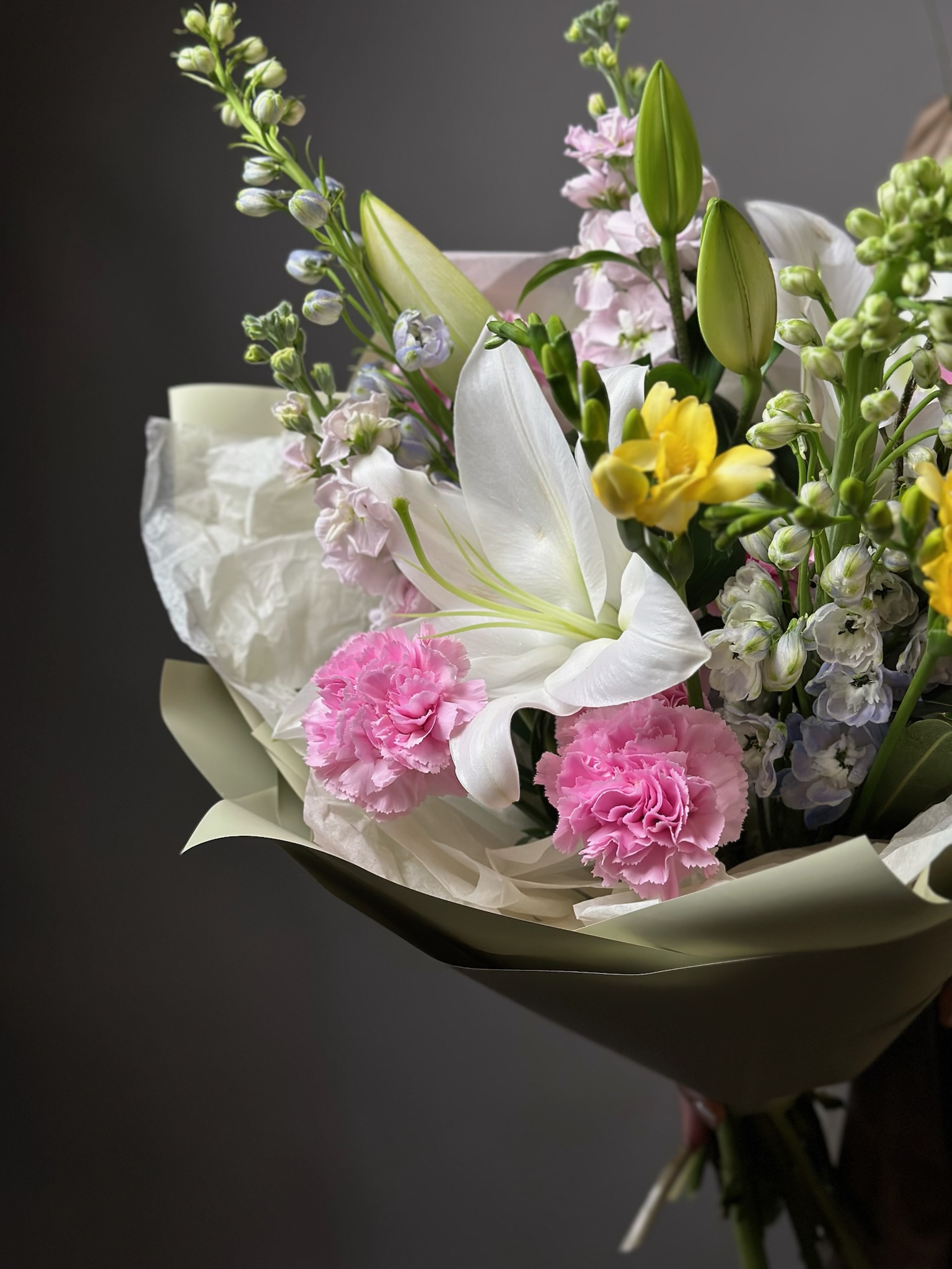 гвоздики, дельфиниум, лилии, маттиола, фрезии, олеандр, самшит, краспедии
