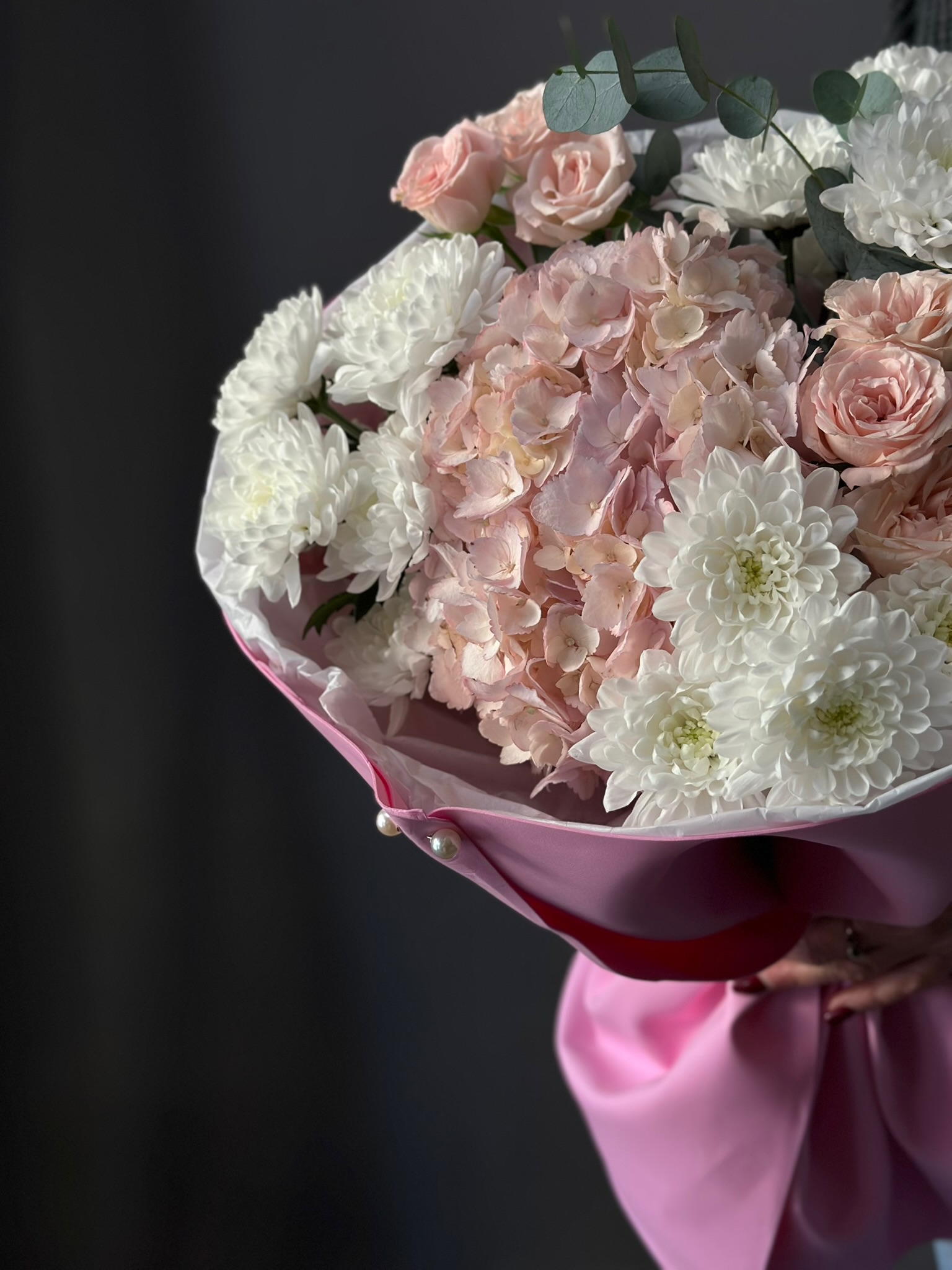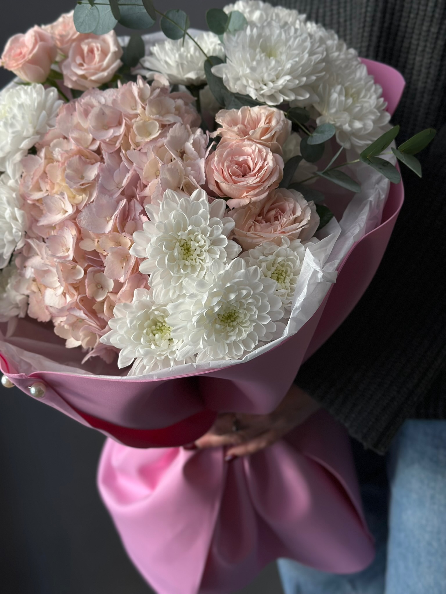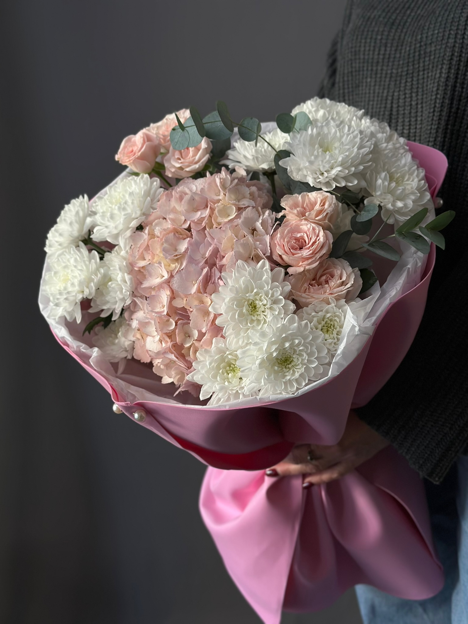 Сборный букет «Летний вальс» от бренда «Цветы Луны» — идеальный подарок близким и друзьям! Яркие краски гортензий, элегантность роз и утонченность эвкалипта создадут праздничное настроение вашему получателю (коллега, учитель, любимый человек, родители, друзья). Подходит к любому празднику – День Рождения, Юбилей, Выпускной, 14 Февраля, 8 марта и др., подчеркнув вашу заботу и внимание. Эксклюзивное исполнение в декоративной пленке и ленте придаст презенту завершенности и шика.