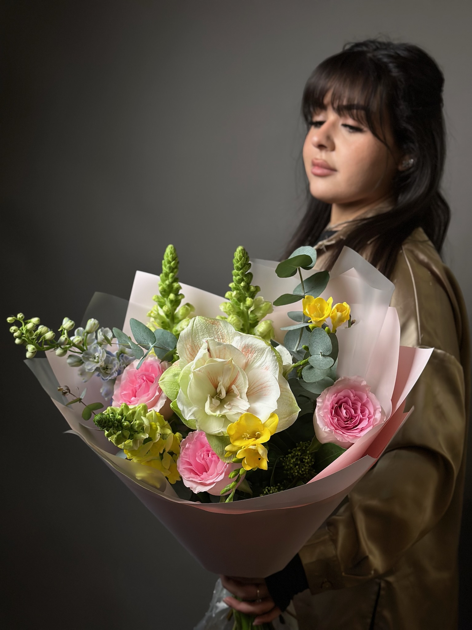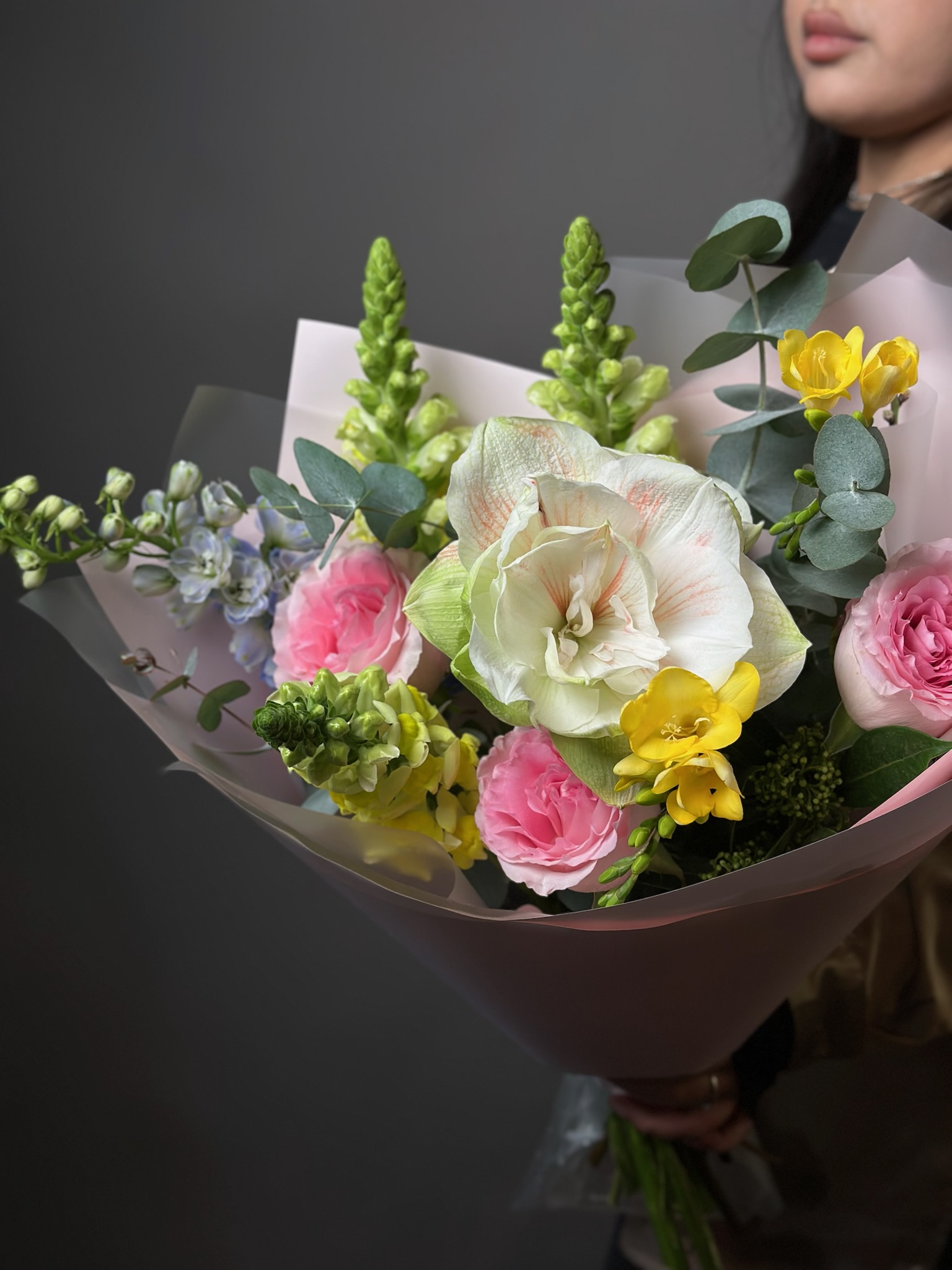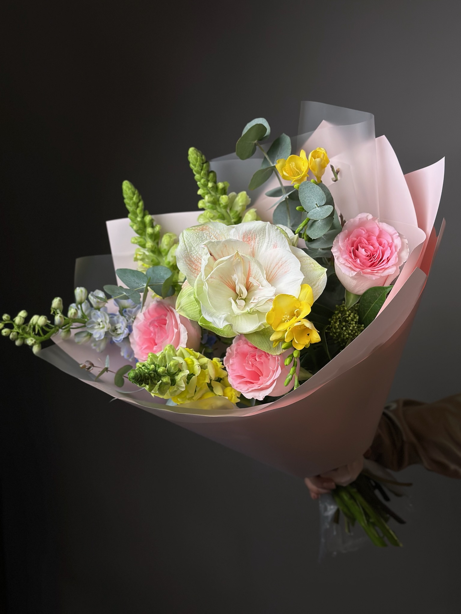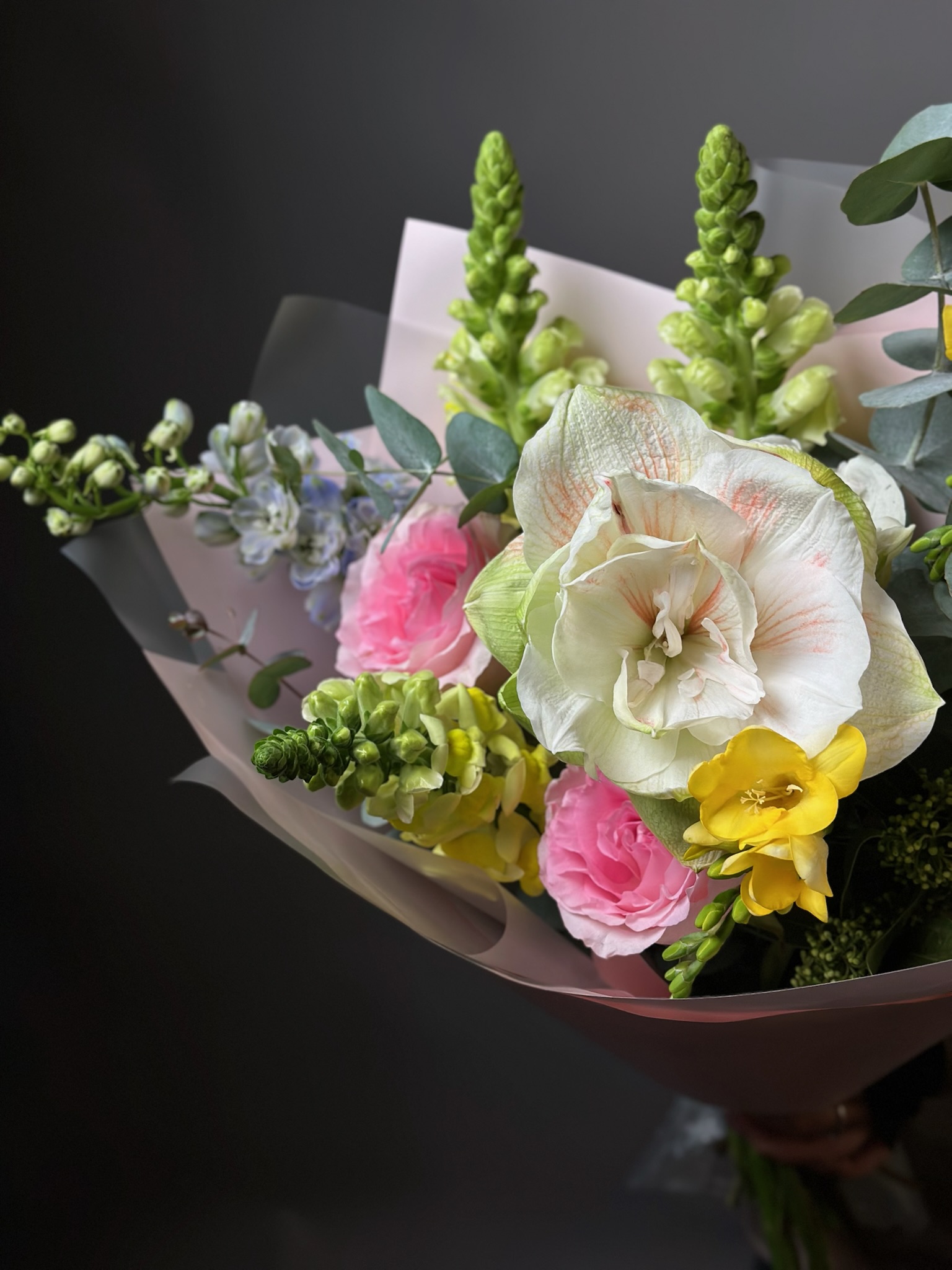 амариллисы, розы, дельфиниум, фрезии, эвкалипт, антирри́нум, скимия, самшит