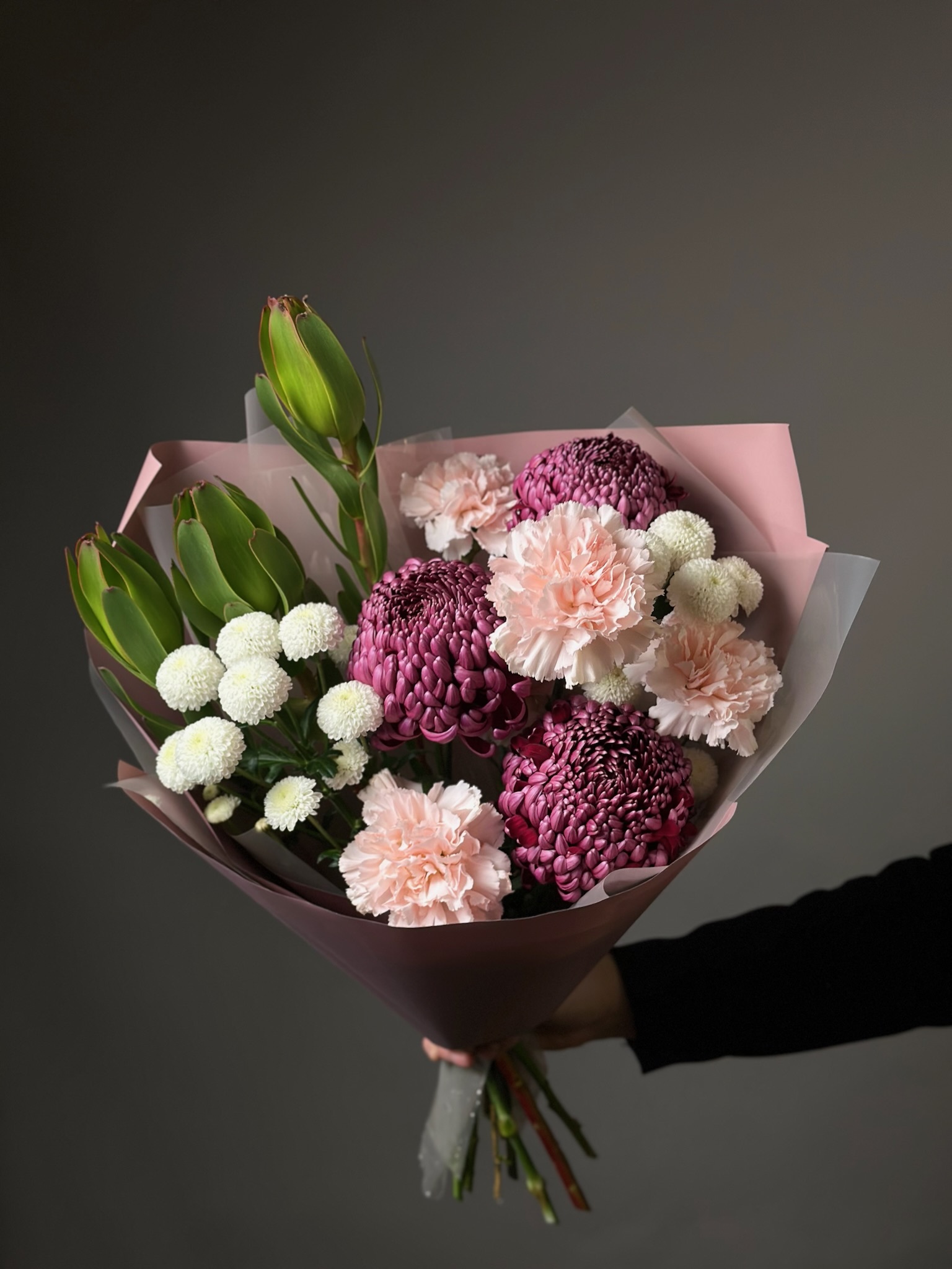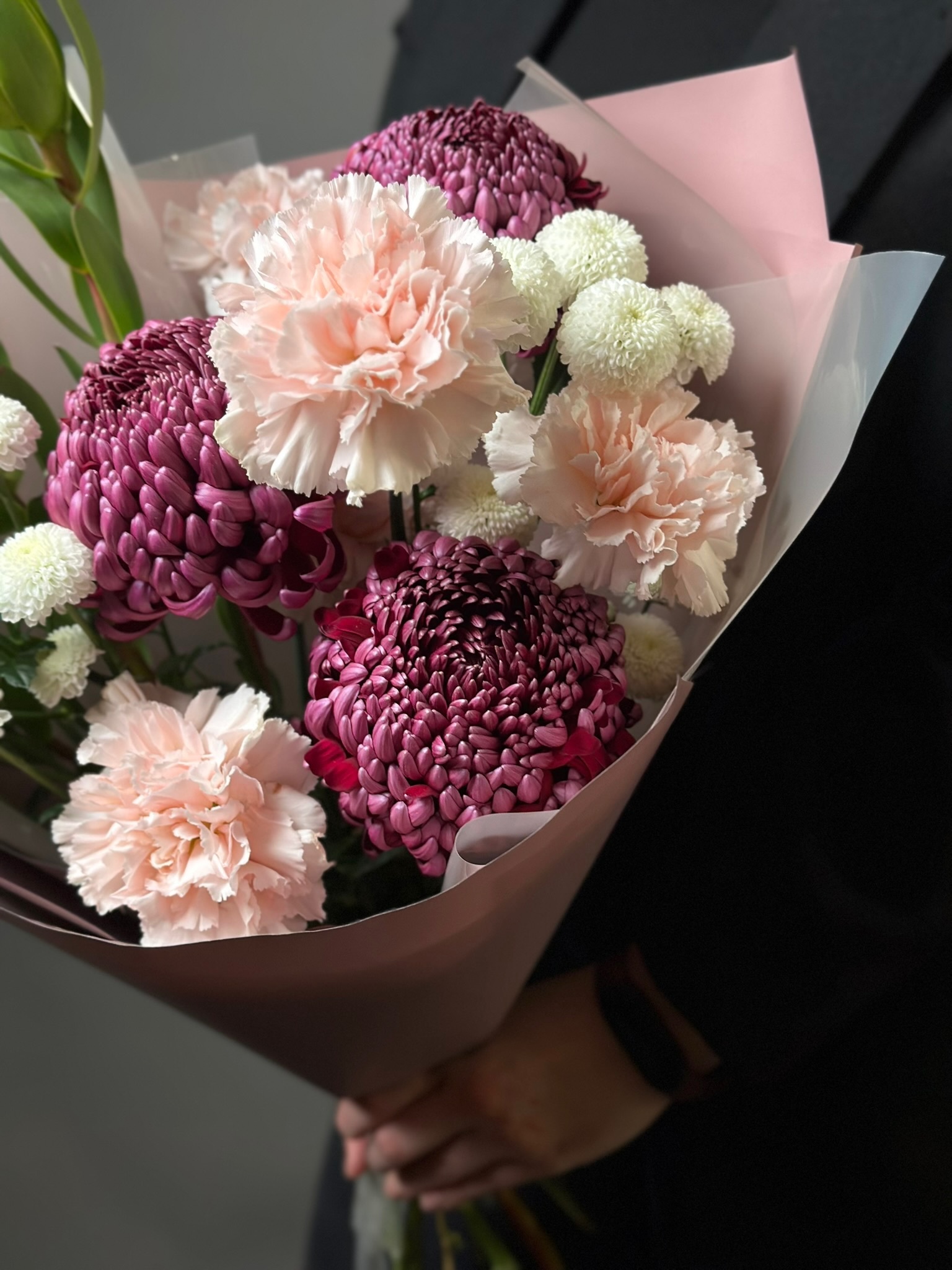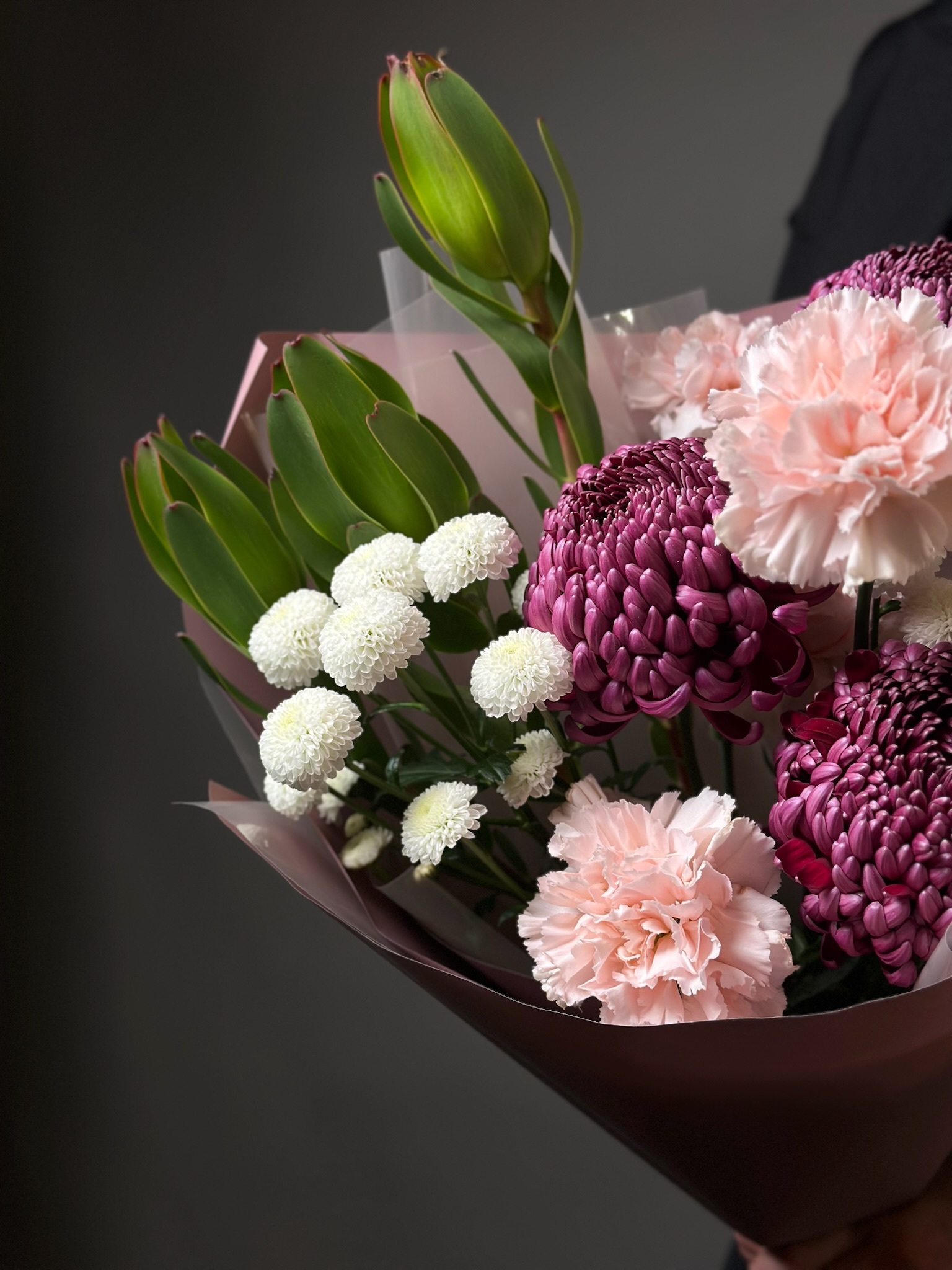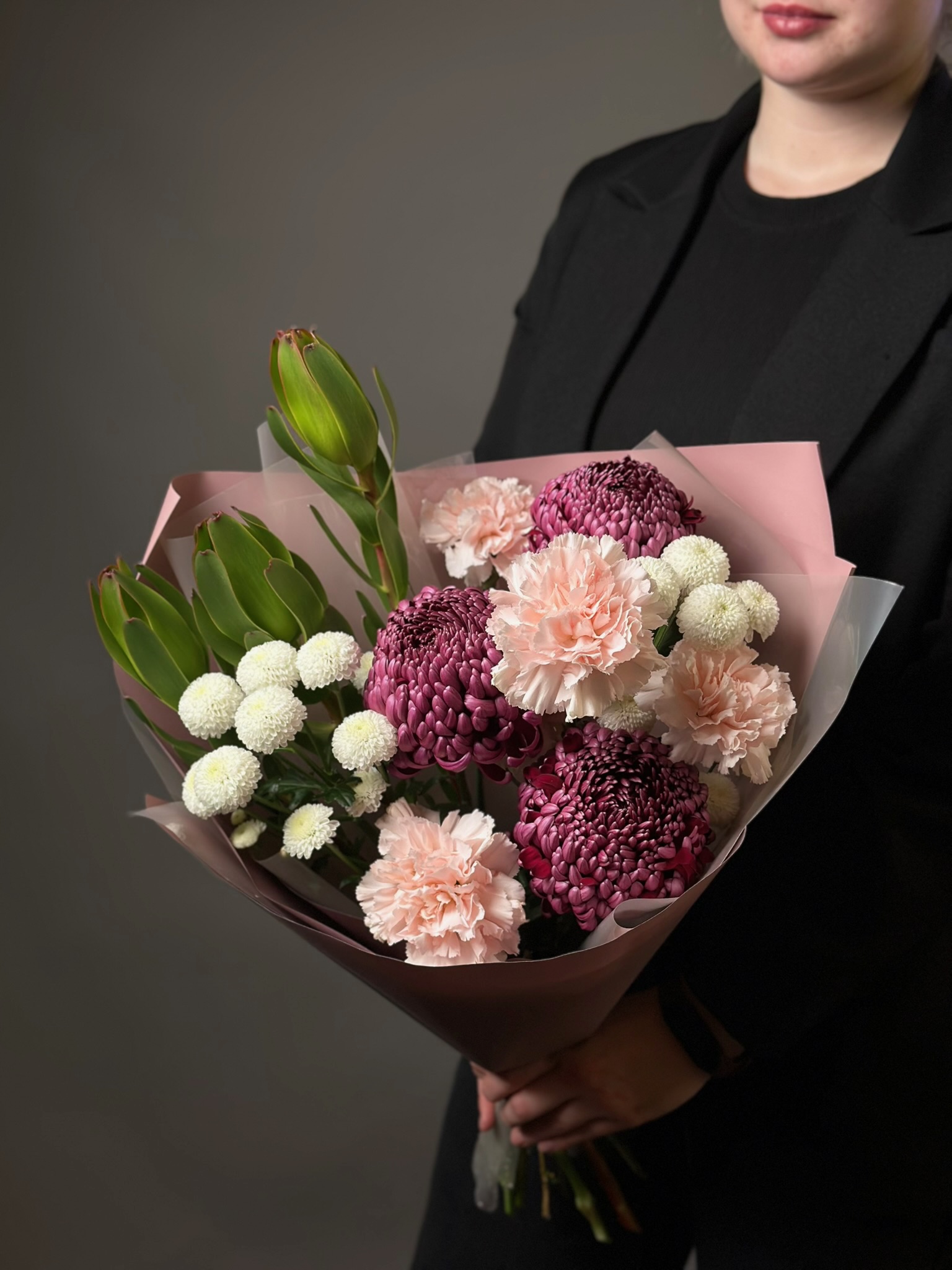 Букет «Нежный Контраст» от бренда «Цветы Луны» — идеальный подарок по любому поводу! Для мамы, любимой, коллеги, партнера или друга. Этот стильный микс из нежных хризантем, элегантного левкадендрона и изящного диантуса подчеркнет вашу заботу и внимание. Элегантное оформление в декоративной пленке и банте придаст презенту завершенность. Подходит к юбилею, дню рождения, свадьбе, празднику 8 марта, Дню Учителя, Вале́нтинову дню и другим событиям. Пусть ваши близкие почувствуют ваше тепло и любовь!