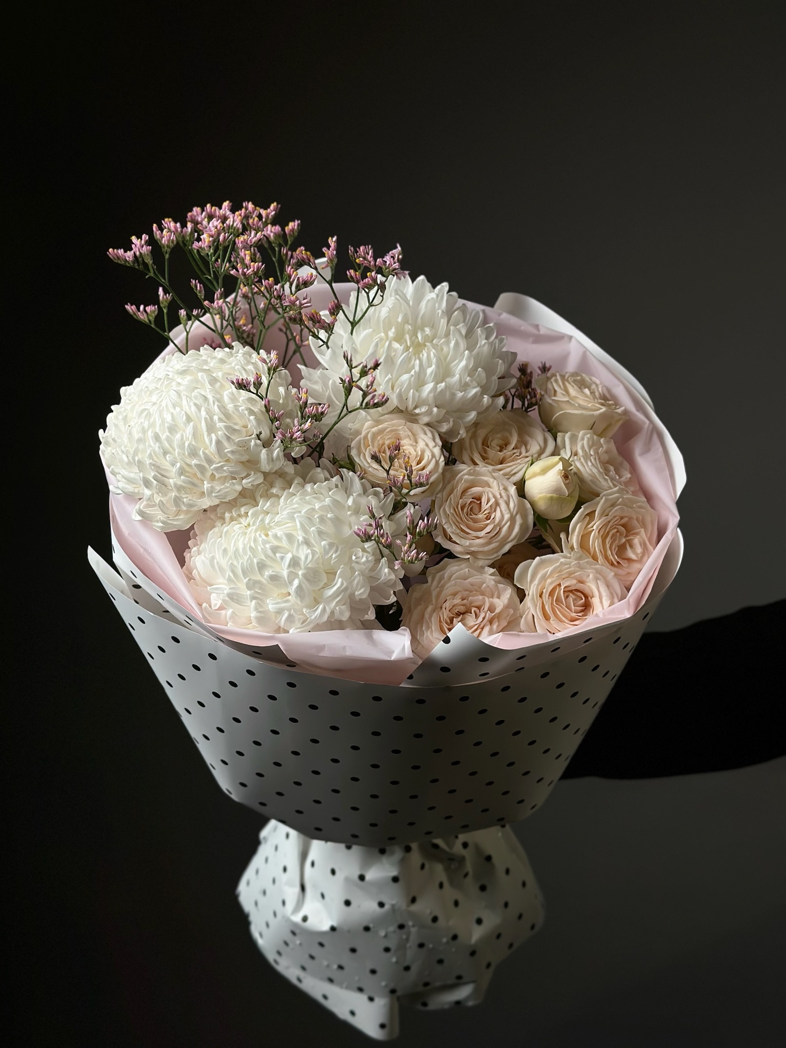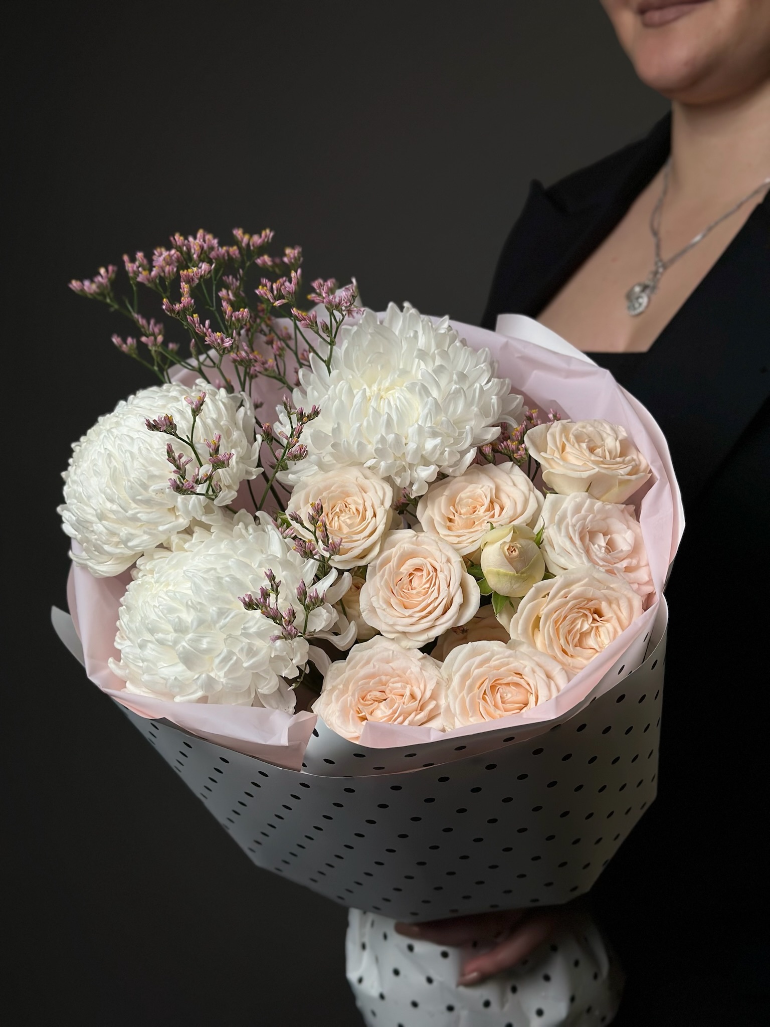 Букет «Палитра нежности» от бренда «Цветы Луны» — изысканный подарок по любому поводу! Подходит мужчинам и женщинам (женихам, невестам, мамам, любимым, бабушкам), идеально впишется в праздник Дня Победы, юбилея, Нового года, 14 февраля и др., подчеркнув вашу заботу о близких. Сборный букет из лимониума, розовых кустиков и хризантем оформлен бантом и декоративной пленкой. Магазин предлагает быструю доставку цветов курьером прямо в Саратове – удобно, быстро, а главное – букет стоит совсем недорого!