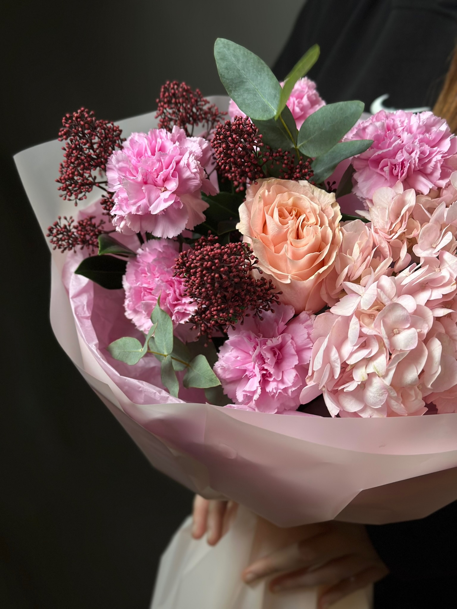 Букет «Пена нежности» от бренда «Цветы Луны» — идеальный подарок близким и друзьям! Гортензия, роза, диантус, эвкалипт и скиммия создают гармонию природной красоты. Оформление в декоративной пленке с бантом подчеркнет индивидуальность подарка. Подходит ко всем праздникам: Дню Рождения, Юбилею, 8 марта, 23 февраля, Выпускному, Новогодним торжествам и другим особенным датам. Подчеркните свои чувства элегантностью этого букета!
