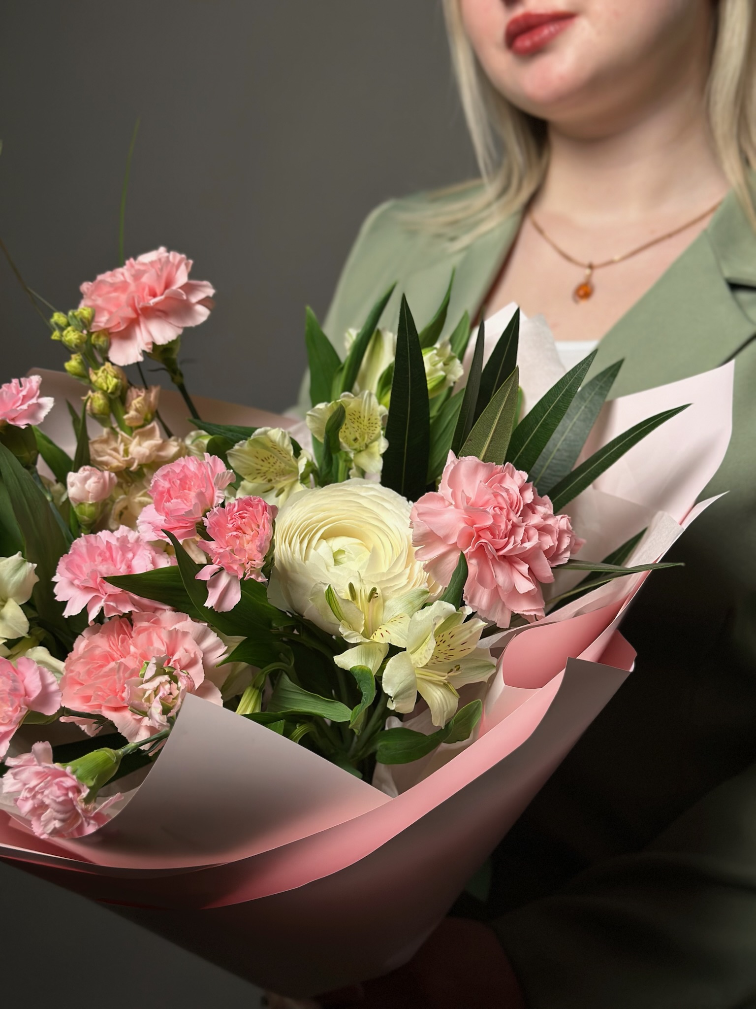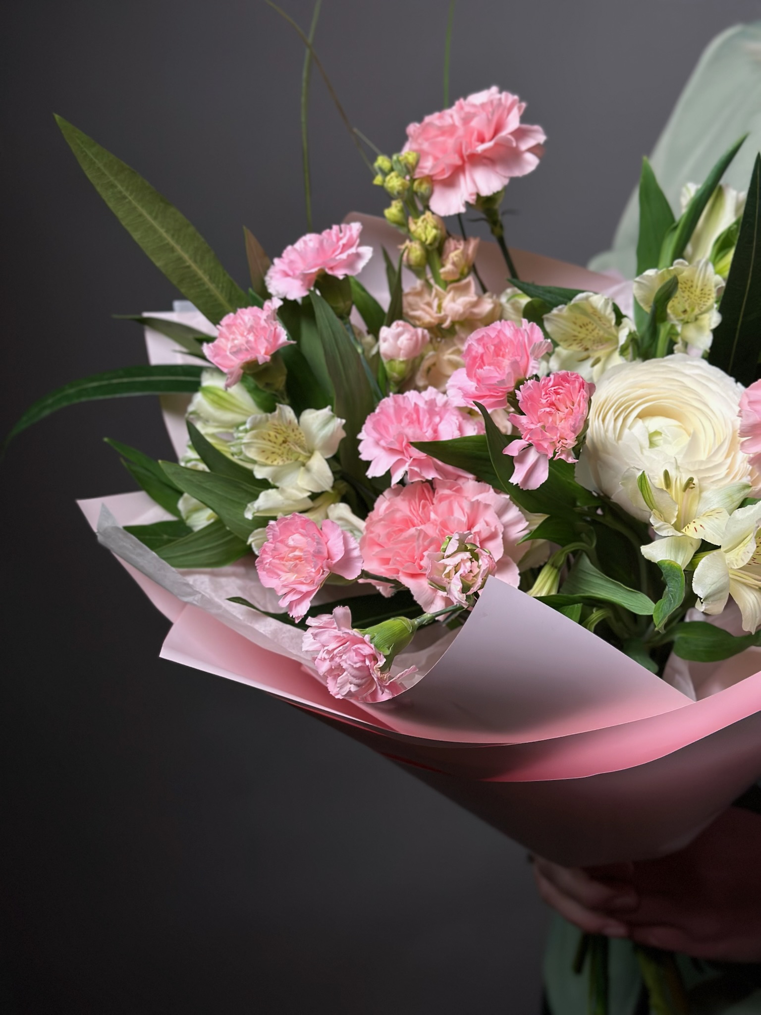 Букет «Розовое очарование» от бренда "Цветы Луны" – это нежность и элегантность в каждом цветке! Маттиолы, гвоздики, альстромерии, гвоздика кустовая, ранункулусы и самшит создают идеальный ансамбль, подходящий как маме, любимой, женщине, так и деловым партнерам, учителям, мужчинам и даже детям. Украшение бантом и декоративной пленкой делает этот букет стильным подарком к любому празднику (День Учителя, Новый Год, свадьба, 8 марта и др.). Не упустите новинку этого сезона!
