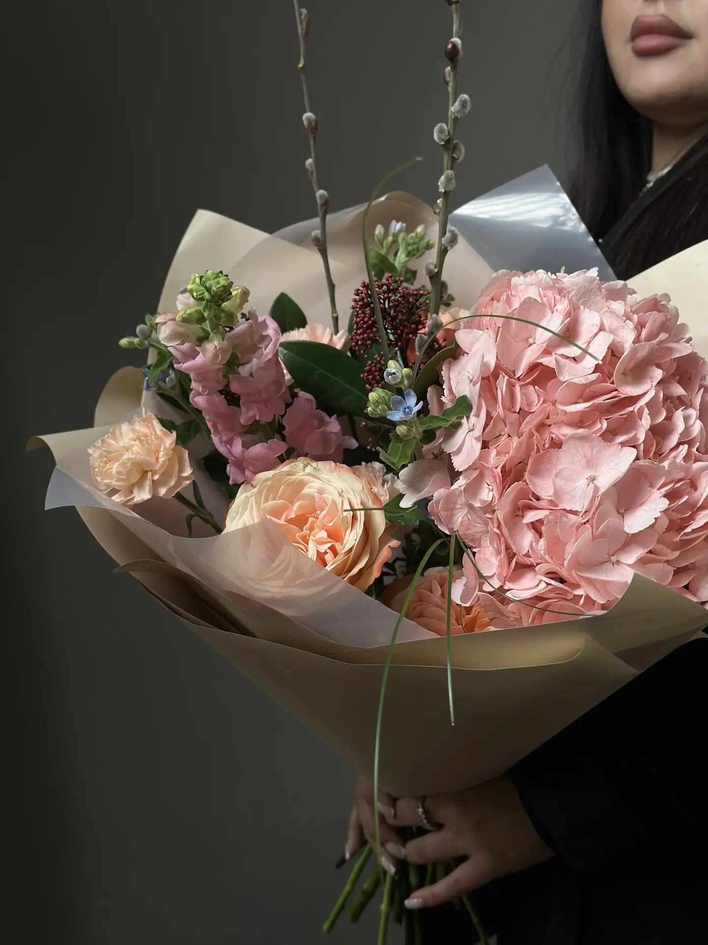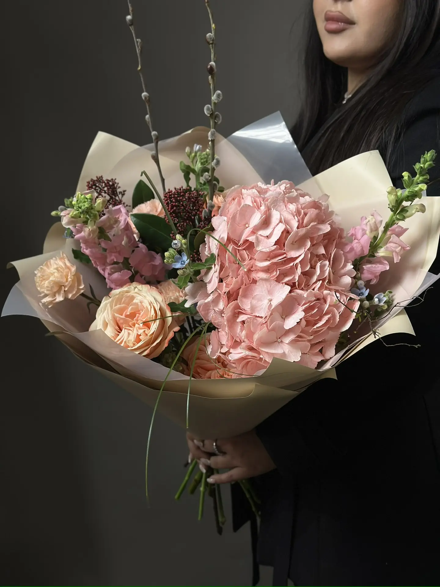 Букет «Розовый шлейф» от бренда "Цветы Луны" — нежное воплощение ваших чувств! Идеально подойдет как сюрприз маме, любимой, женщине-коллеге, преподавателю или даже мужчине (например, на День защитника отечества). Благодаря разнообразию поводов применения, станет оригинальным подарком к любому событию: дню рождения, юбилею, свадьбе, 14 февраля или 8 марта. Элегантные розовые оттенки скимии, гортензий, роз, оксипеталума, гвоздичек-диантуса и изящной вербы дополнены стильным бантом и декоративной пленкой – прекрасный выбор для особенного человека!
