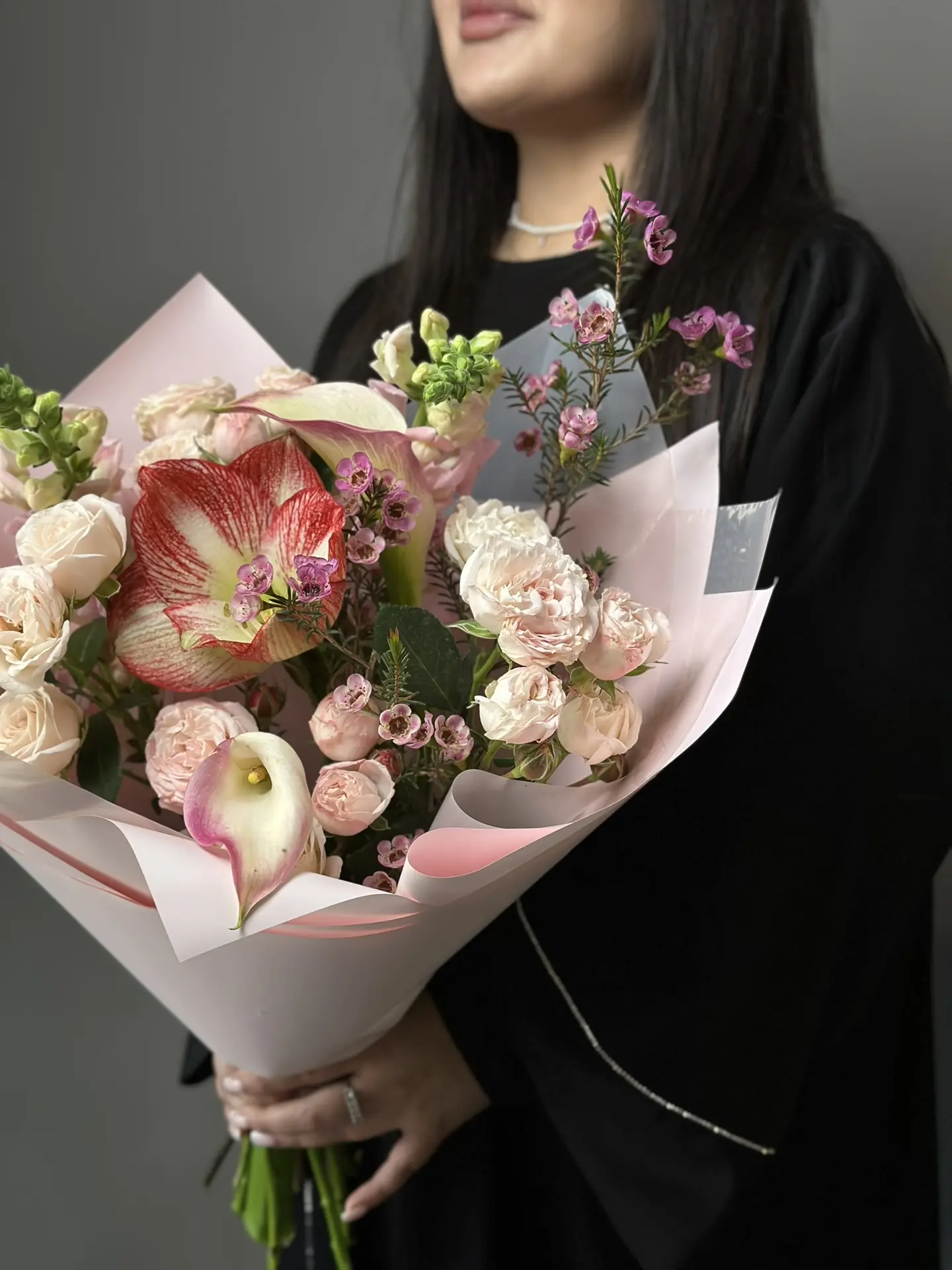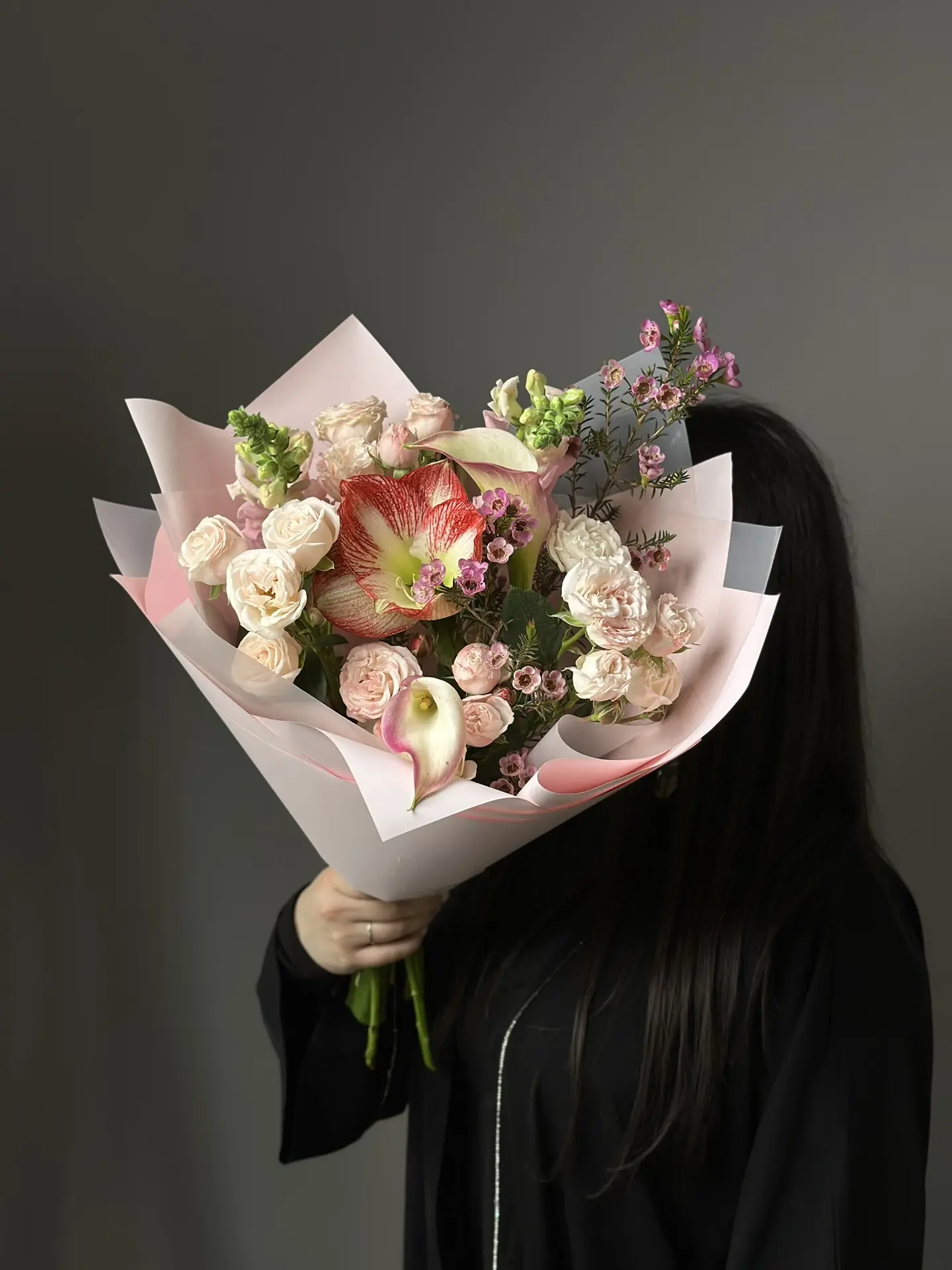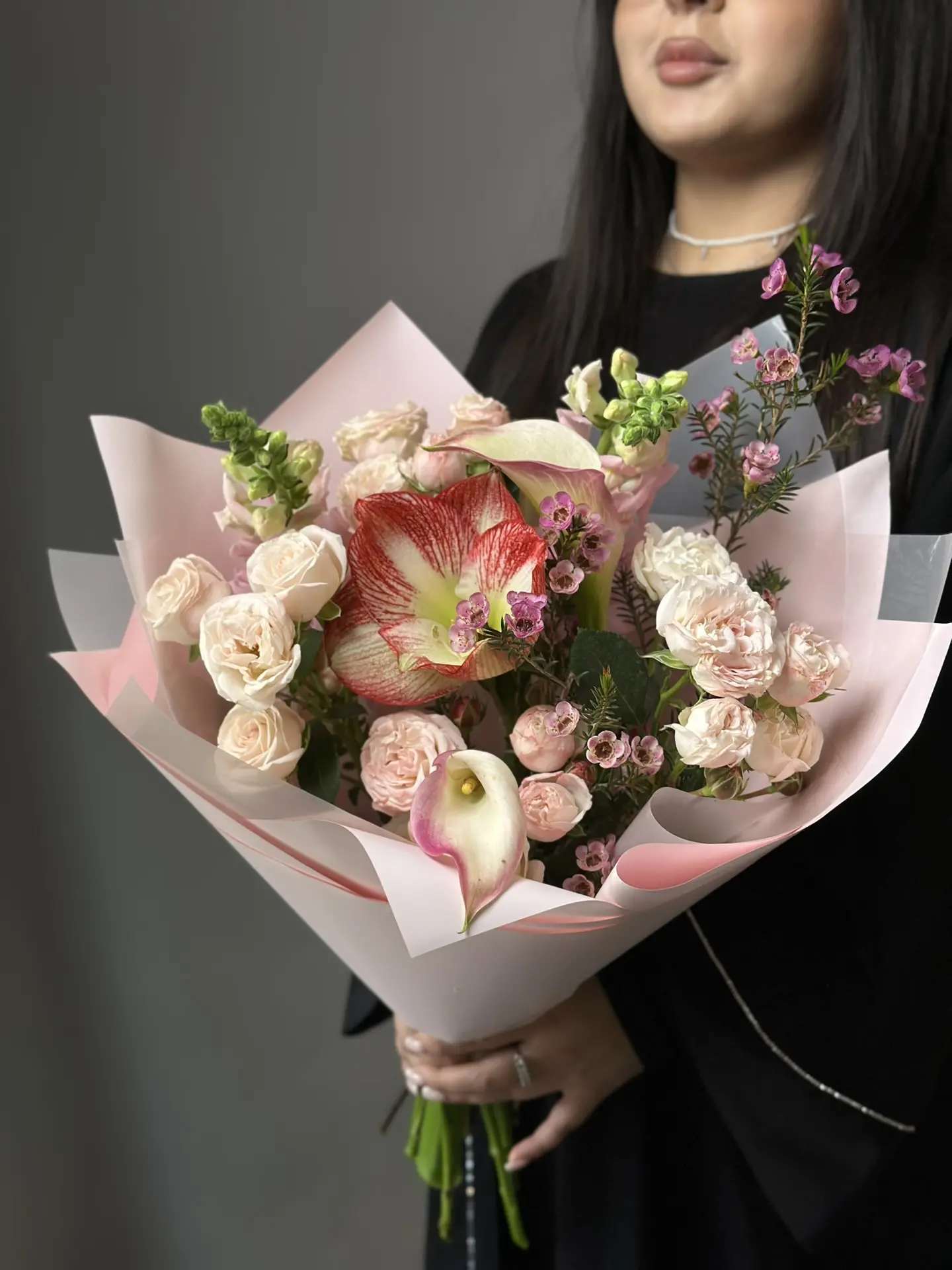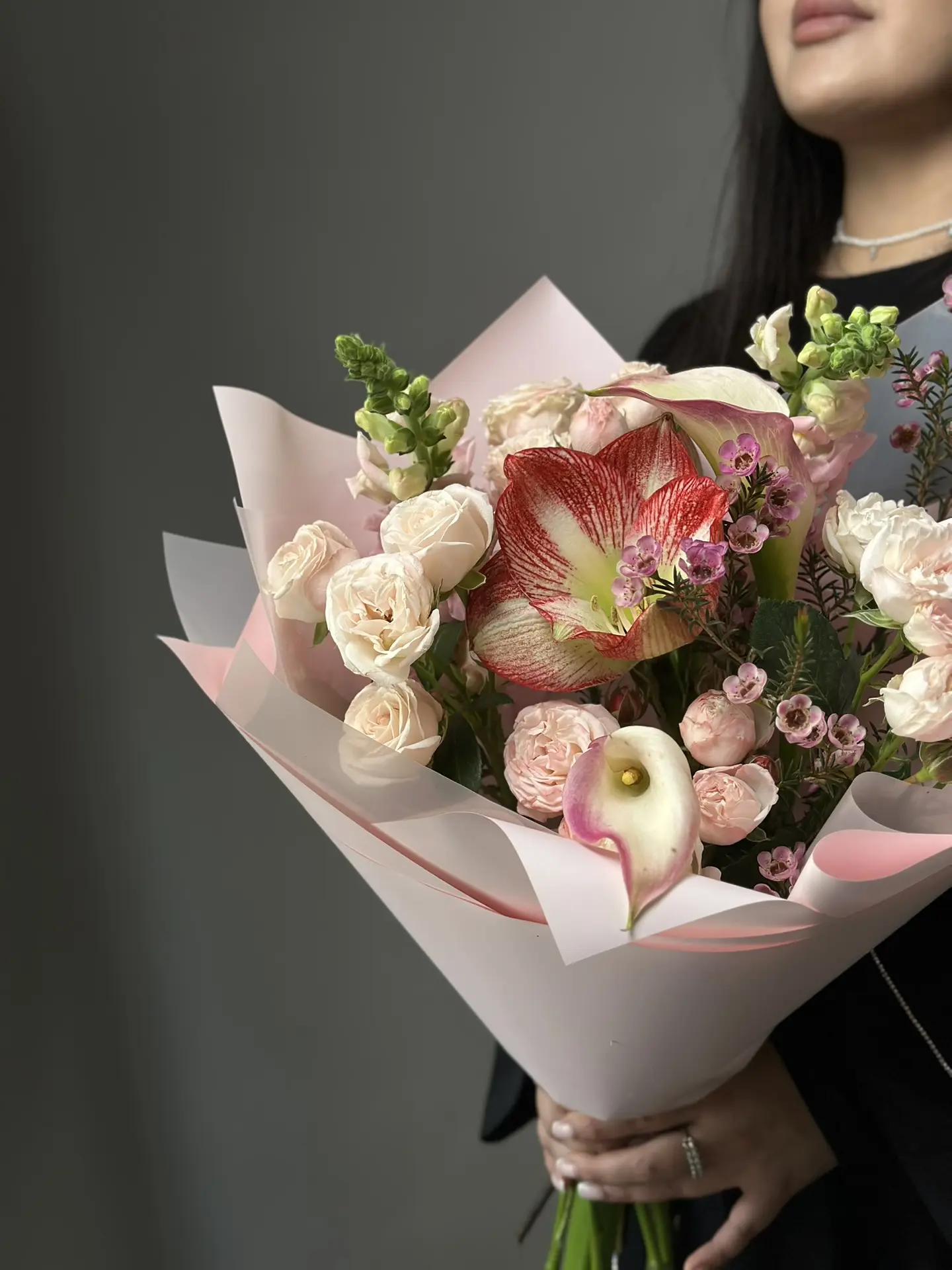 Букет «Розовый туман» от бренда «Цветы Луны» — нежное сочетание антириума, амариллиса, хамелауциума, роз и калл. Подходит всем: любимым женщинам, мамам, учителям, мужчинам-партнёрам и даже детям! Идеален для любых событий – от Дня Святого Валентина и Нового года до юбилея или дня рождения. Элегантно оформленный бантом и декоративной пленкой, этот букет порадует близких оригинальностью и свежестью новенького подарка.