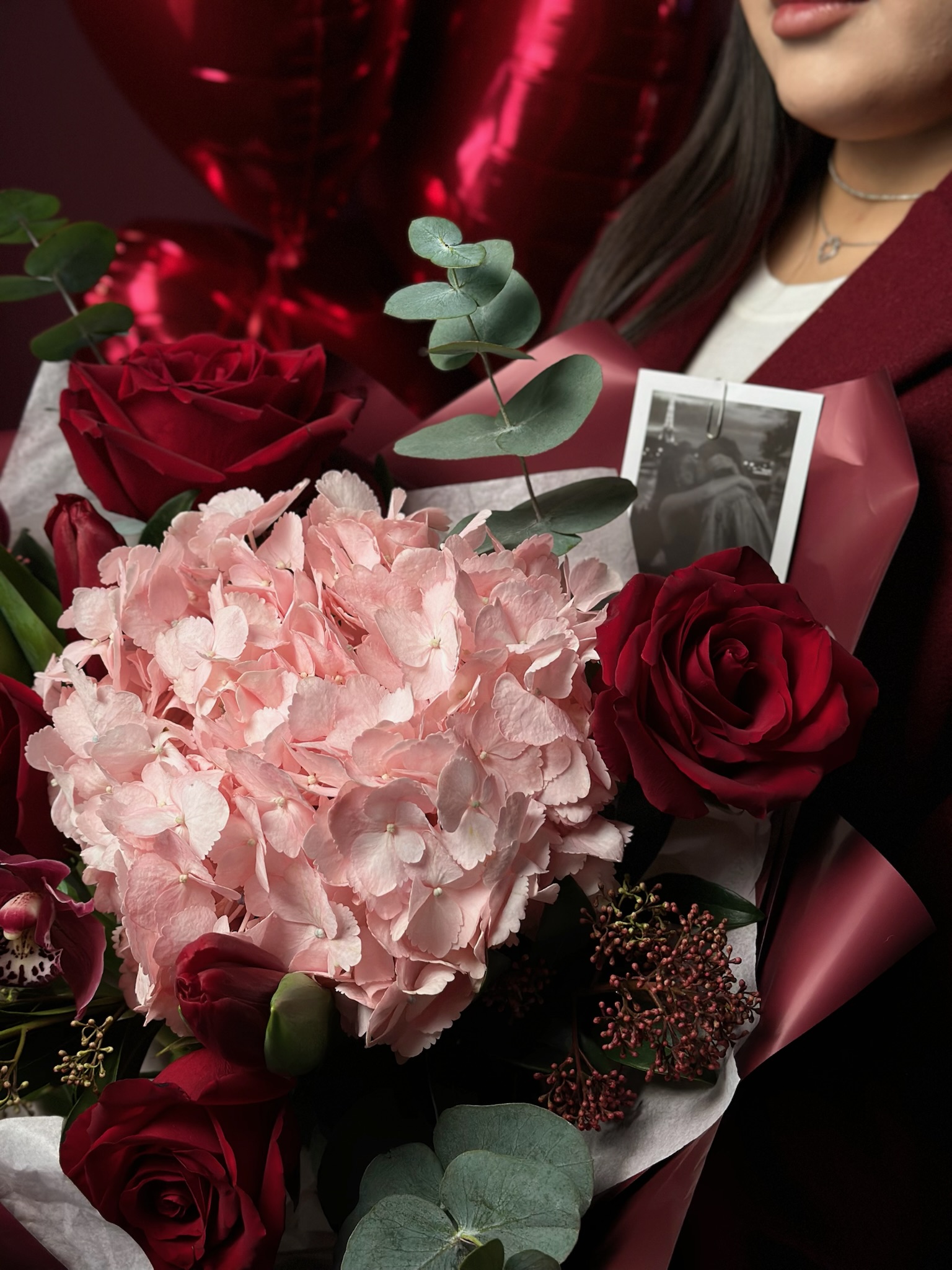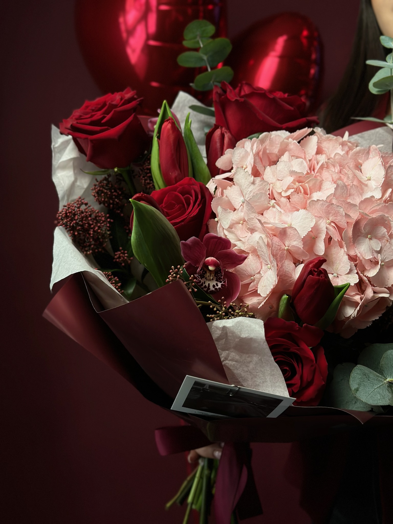 Сборный букет «Валентинка» от бренда 'Цветы Луны' — идеальный способ выразить чувства любимым, близким и даже деловым партннерам! Элегантные гортензии, роскошные цимбидиумы, нежные тюльпаны, великолепные розы и изысканный эвкалипт подарят радость по любому поводу: будь-то День Святого Валентина, День Рождения, Юбилей, 8 марта или другой праздник. Красиво оформленный бантом и декоративной пленкой букет подчеркнет вашу заботу и внимание к близкому человеку. Не упустите новинку этого сезона!