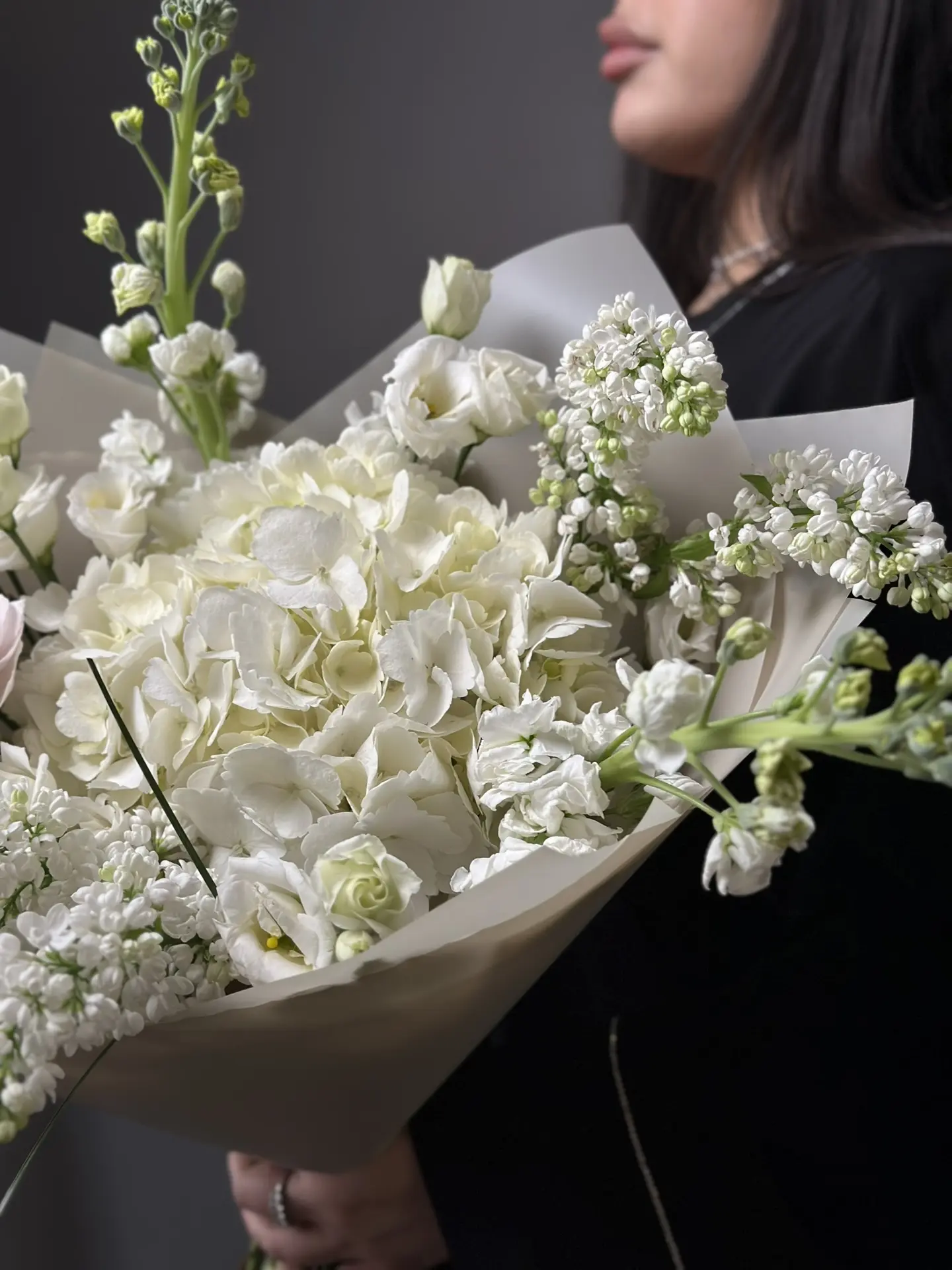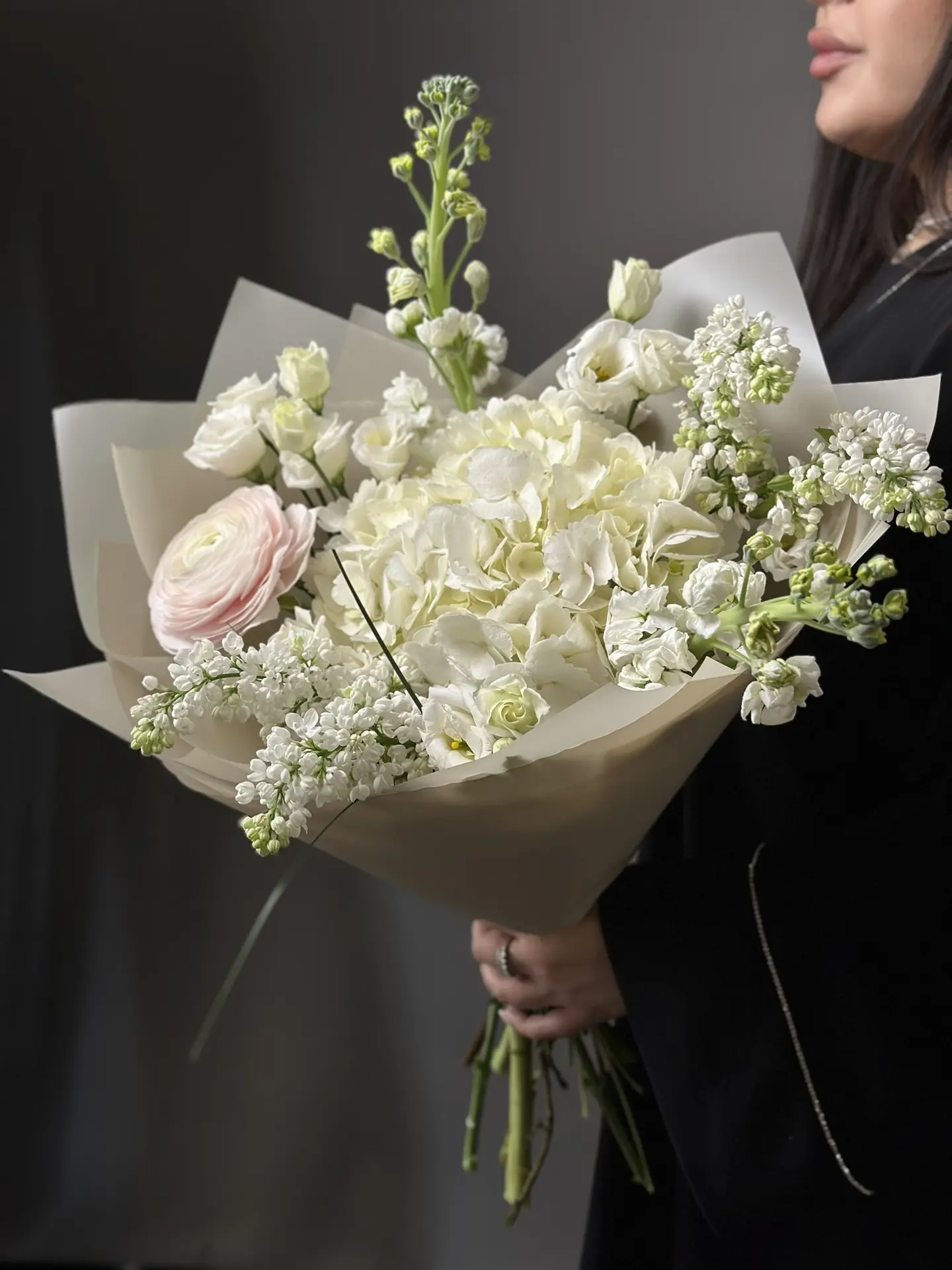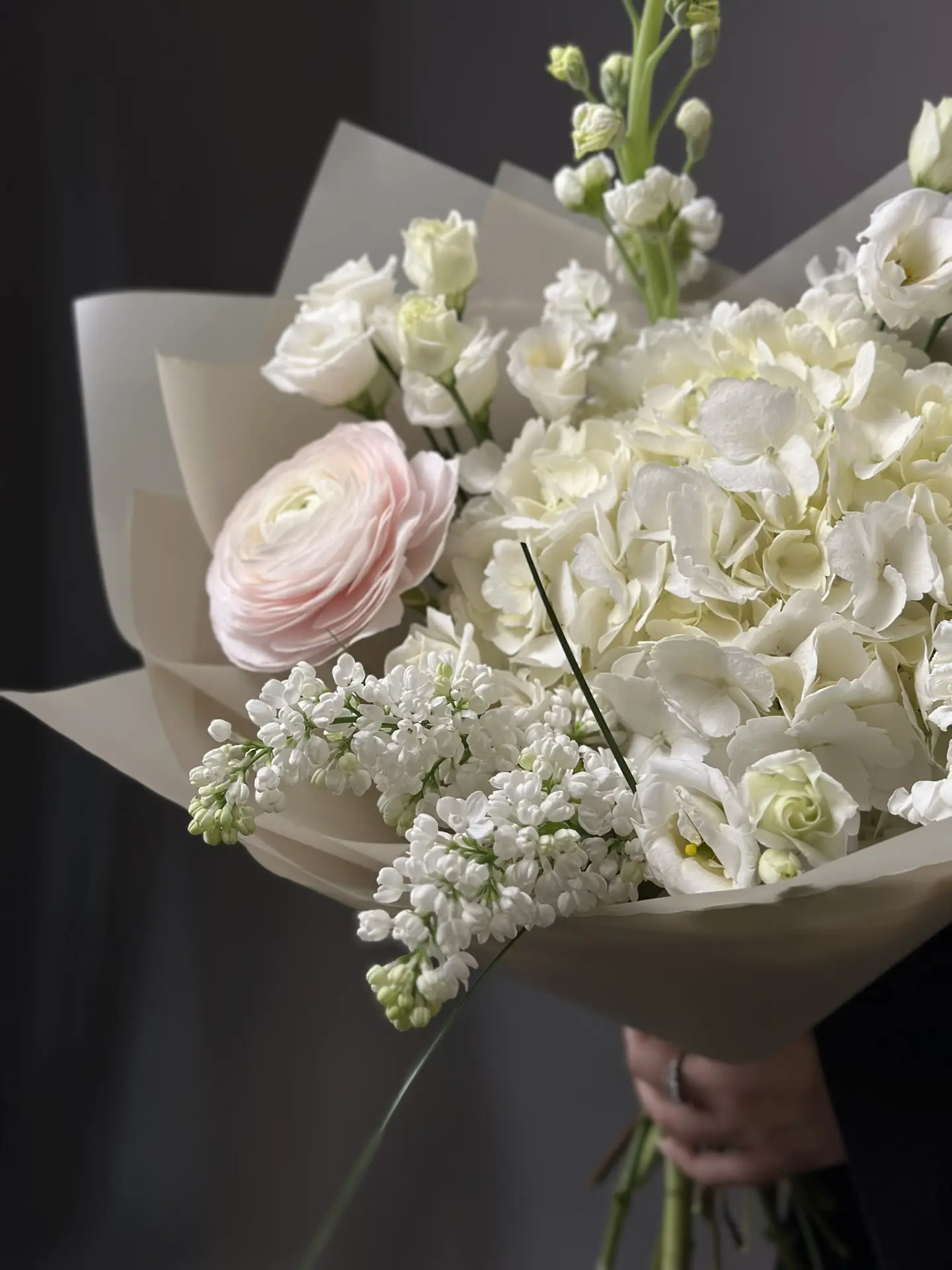 Букет «Ваниль» от бренда «Цветы Луны» — идеальное решение для любого праздника! Эустомы, сирень, ранункулусы и гортензия создают нежную гармонию цвета и аромата. Подходит для подарка маме, любимой, женщине-коллеге, преподавателю или даже мужчине. Подойдет к любому торжеству – Дню Святого Валентина, 8 марта, дню рождения, юбилею и другим праздникам. Украшен лентой и декоративной пленкой. Покорите сердца близких великолепным подарком!