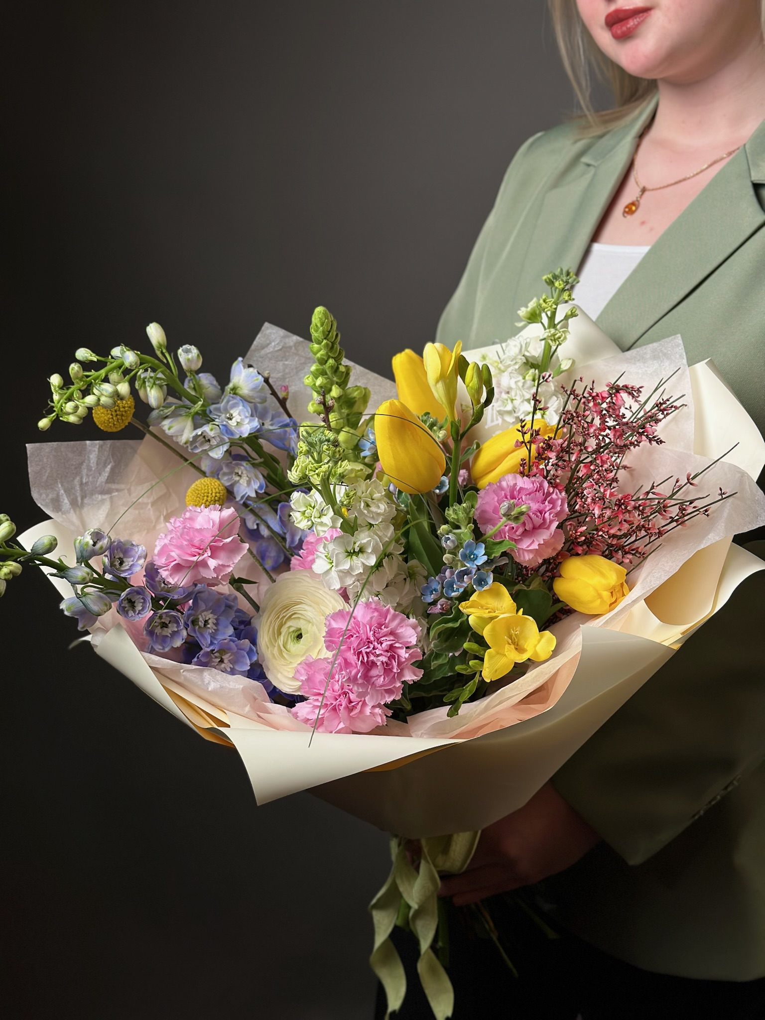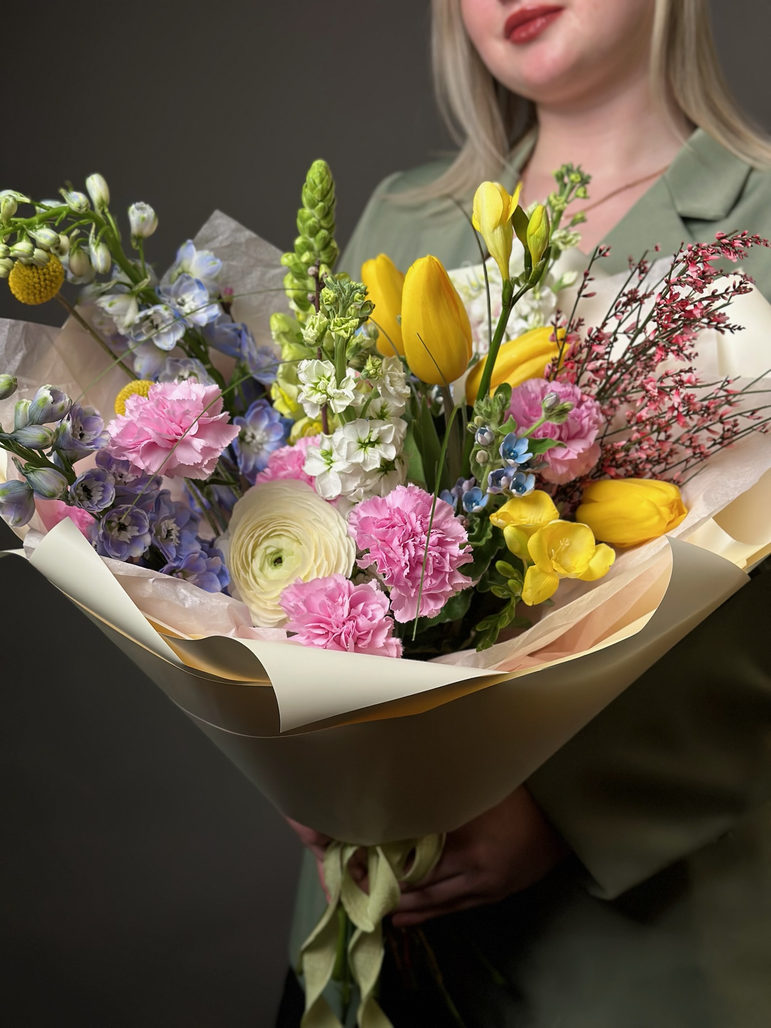 Погрузитесь в волшебную атмосферу природы вместе с роскошным сборным букетом от бренда "Цветы Луны"! Гвоздики, тюльпаны, ранункулусы и другие изысканные цветы создадут незабываемый подарок вашему любимому человеку, коллеге или близкому другу. Идеально подойдет как сюрприз по случаю дня рождения, юбилея, Дня всех влюблённых или профессионального праздника! Элегантное исполнение с бантом подчеркнёт индивидуальность вашего жеста. Букет подарит радость каждому!!
