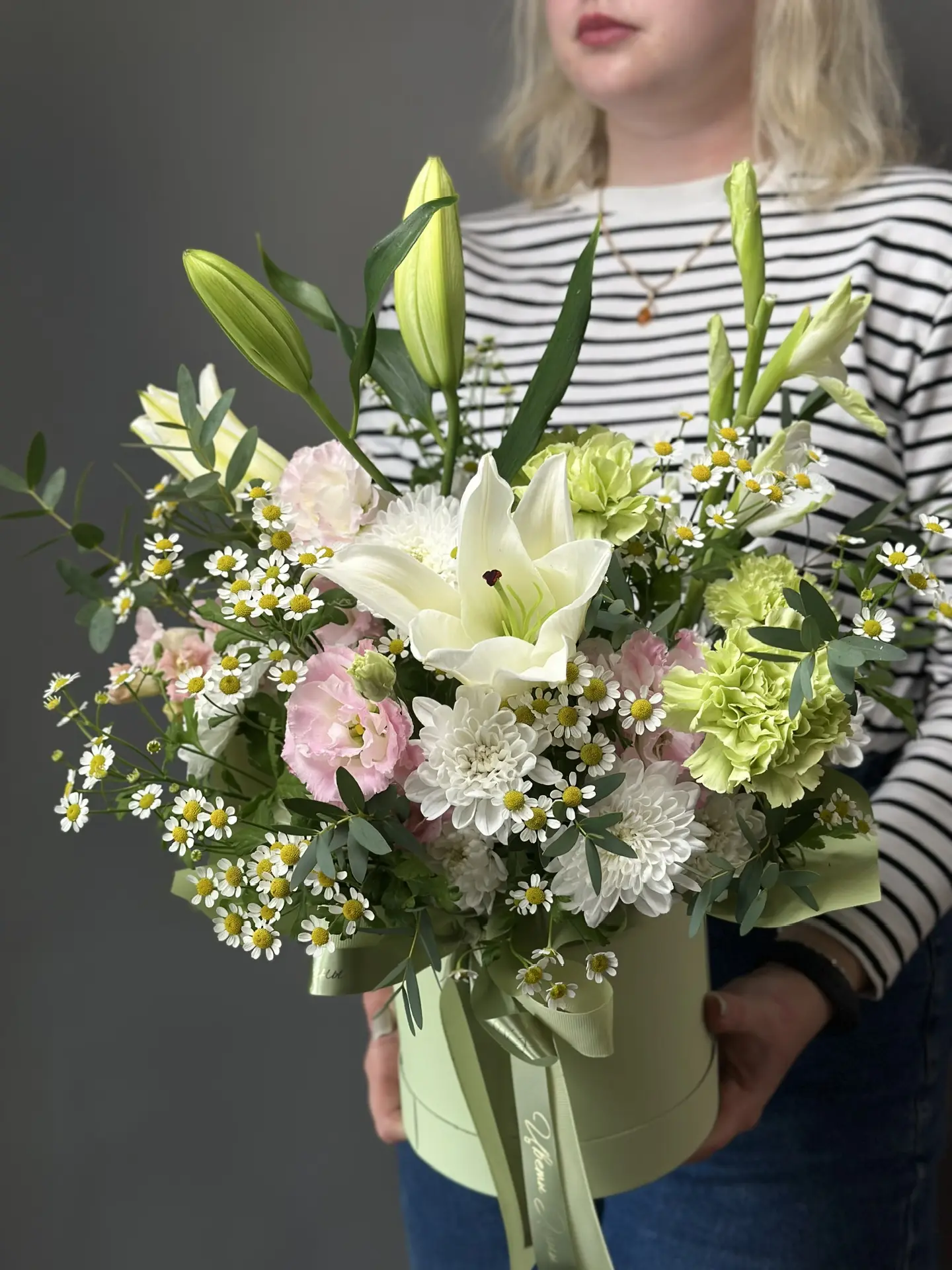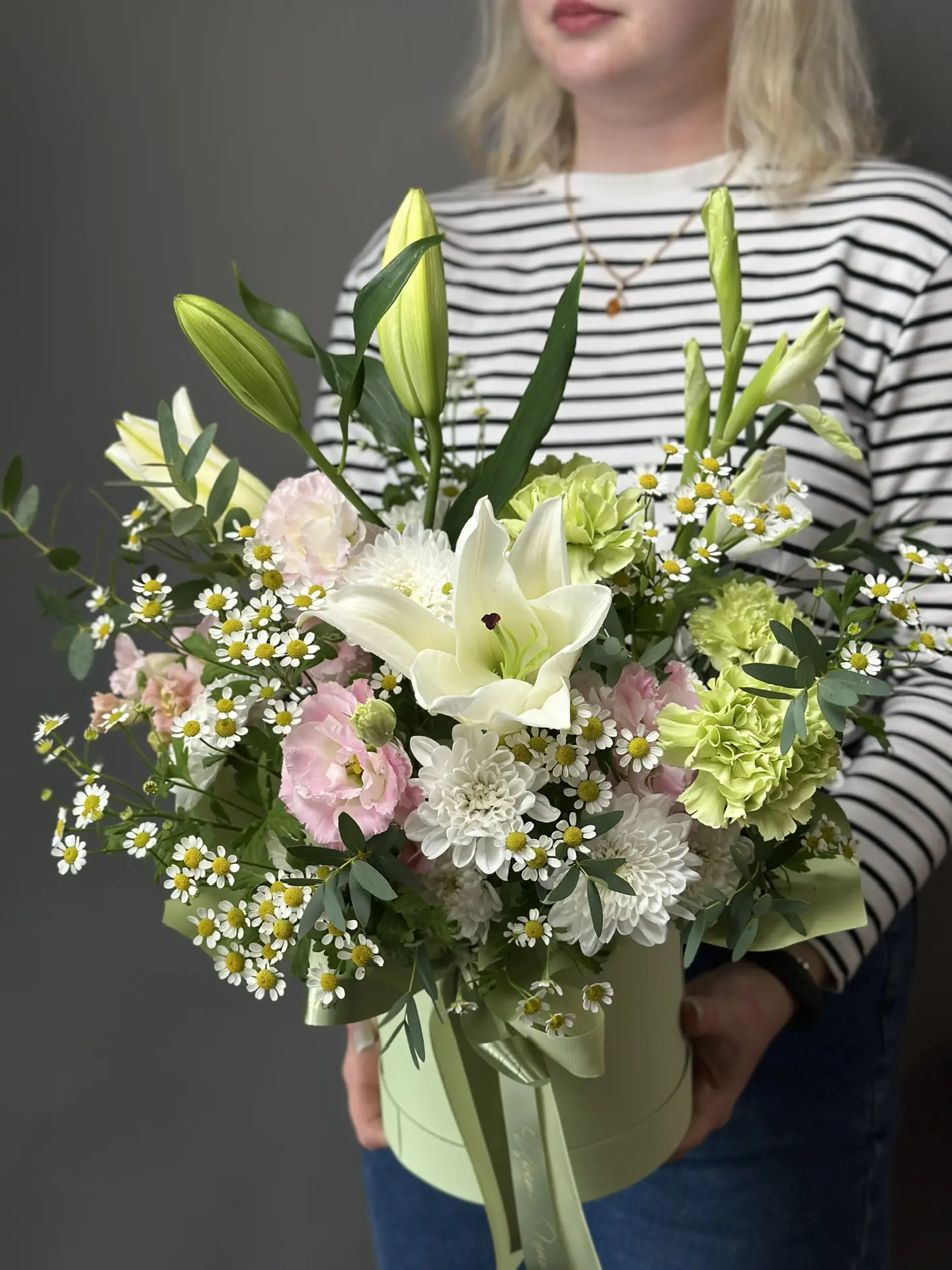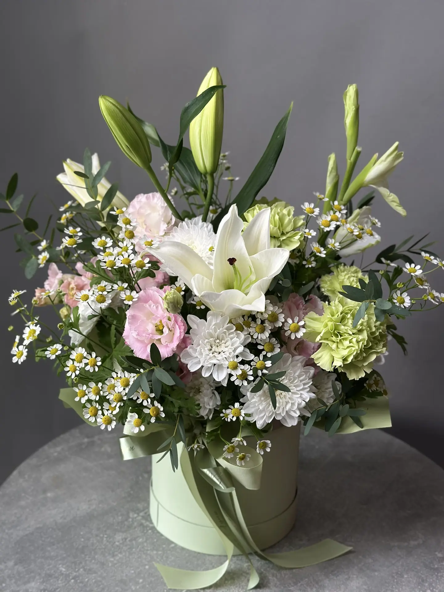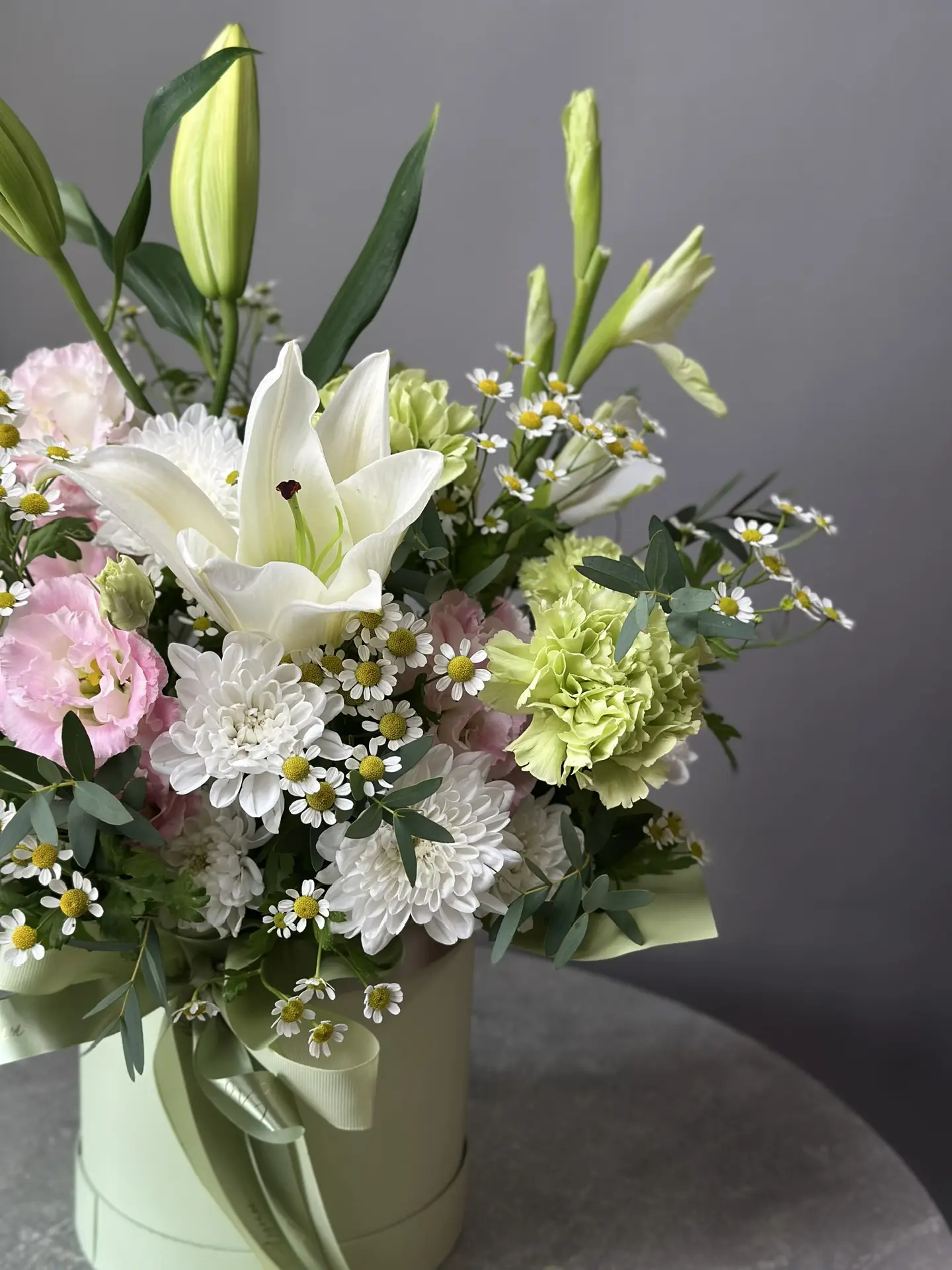 «Элегантность в ларце» от бренда "Цветы Луны" – это изысканный букет в стильной шляпной коробке, перевязанной шелковым бантом. Композиция из благородных лилий, утонченных гладиолусов, нежного танацетум, изящных эустом, хрупких диантус и элегантных хризантем. Идеальный подарок любимым, близким и партнерам по любому поводу! Родителям, супругам, учителям, друзьям и коллегам – всех покорит такая красота! Упаковка из прочного картона с шелковым бантом обеспечивает надежную защиту цветов. Подходит для использования в качестве подарка на праздники и особые случаи.!