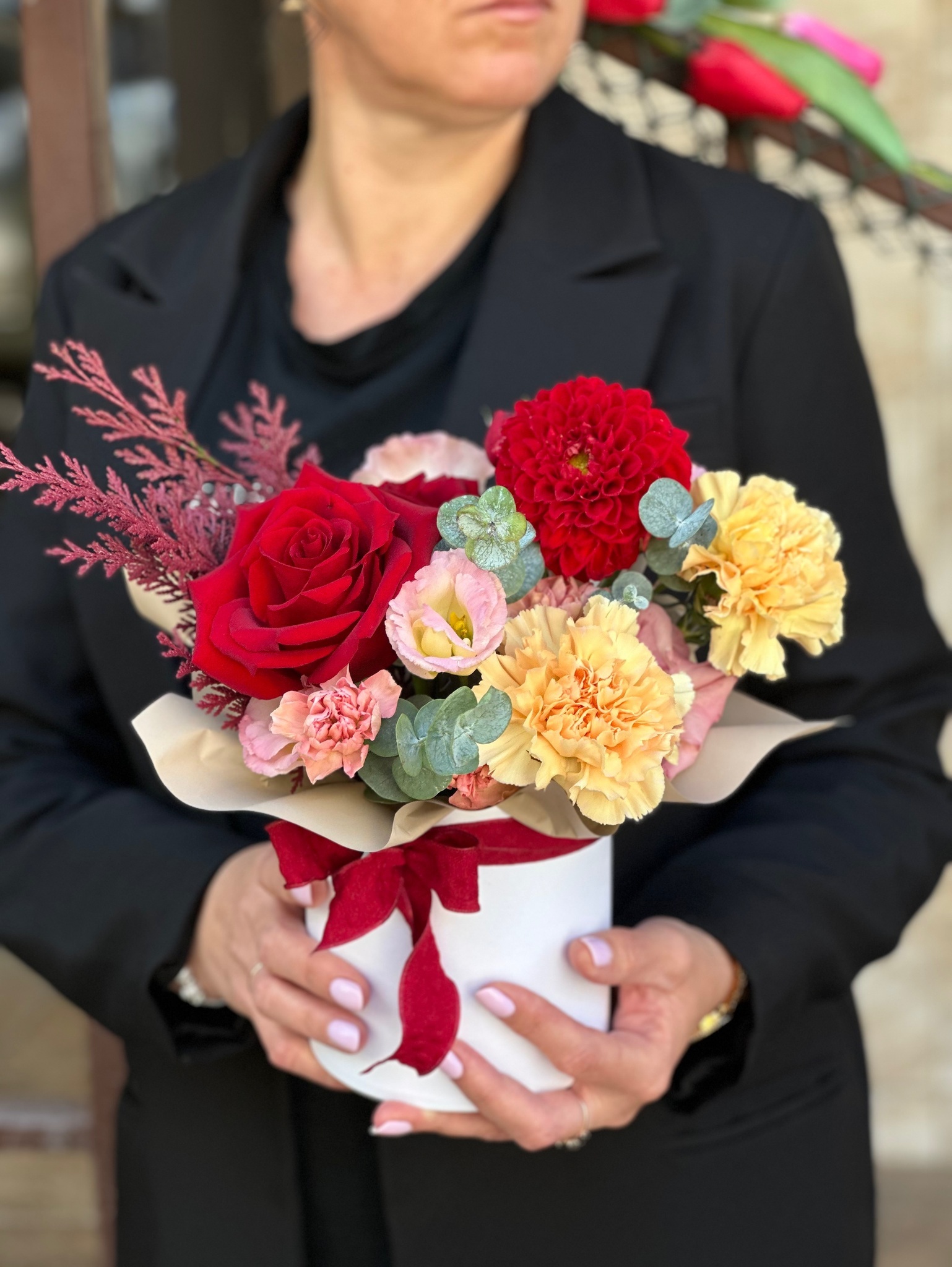 Предлагаем вашему вниманию стильную цветочную композицию "Комплимент" от нашего магазина "Цветы Луны", расположенного в Саратове! Наш профессионально подобранный букет из свежих хризантем, альстромерий, роз, эвкалипта и других видов цветов будет идеальным подарком к любому поводу — будь то день рождения, юбилей, 8 марта или любой другой праздник. Элегантная упаковка в виде шляпной коробки с декоративным бантом придаст дополнительную элегантность и подчеркнет ваше внимание к деталям. Мы обеспечиваем оперативную курьерскую доставку по городу, чтобы ваш подарок прибыл точно в срок и вызвал самые положительные эмоции у получателя. Заходите на наш сайт и выбирайте прекрасные цветы без лишних хлопот — мы сделаем все возможное, чтобы порадовать вас качеством и ценами наших услуг!