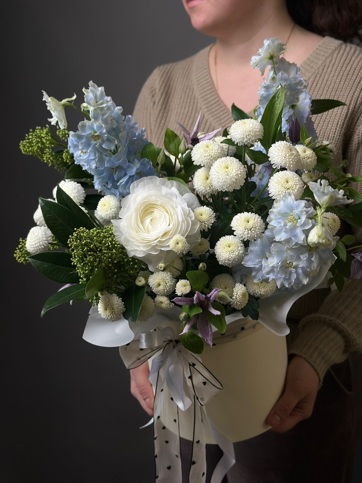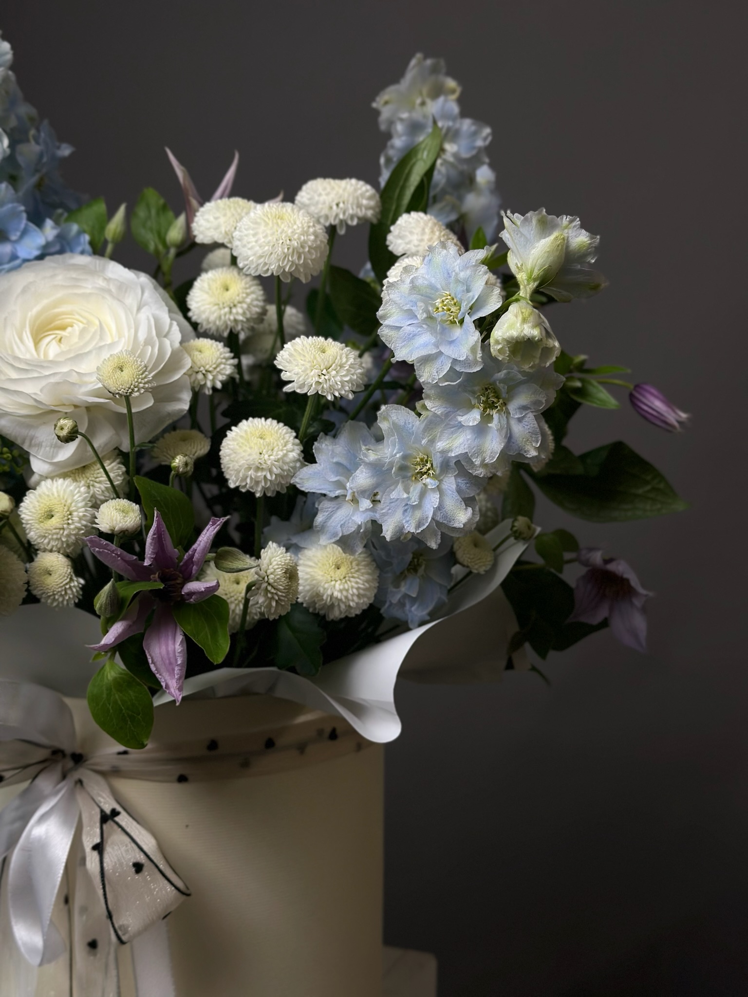 «Цветочная шкатулка» от бренда «Цветы Луны» — идеальный подарок для близких людей! Любимые цветы (клематис, дельфиниумы, ранункулусы) упакованы в стильную шляпную коробку с бантом-поду лентой. Подходит мамам, любимым, женщинам, мужчинам, детям и даже деловым партнерам. Прекрасно смотрится на праздниках – свадьбе, юбилее, Дне Победы, Выпускном, 14 Февраля, Новогодних торжествах и других мероприятиях.