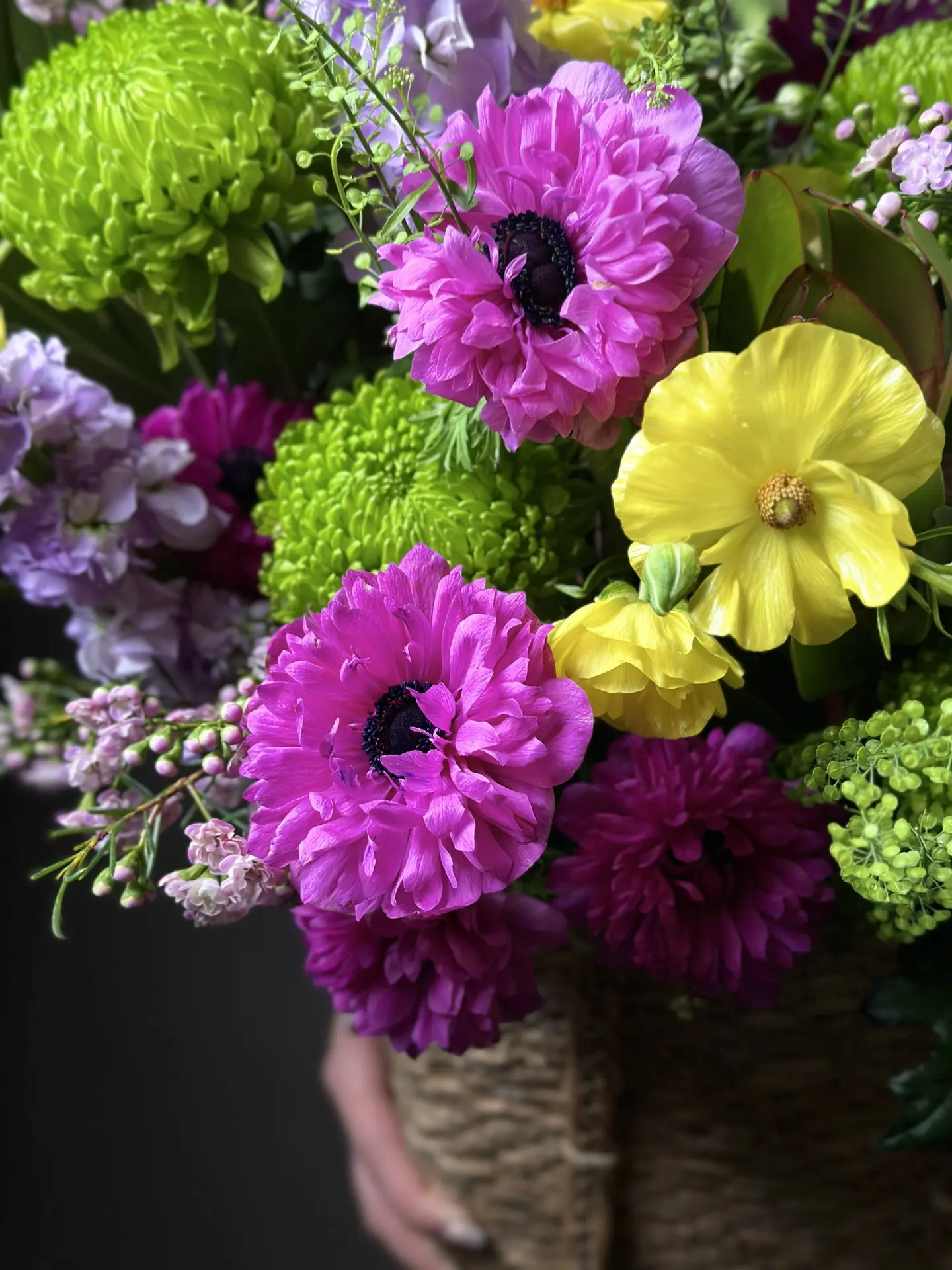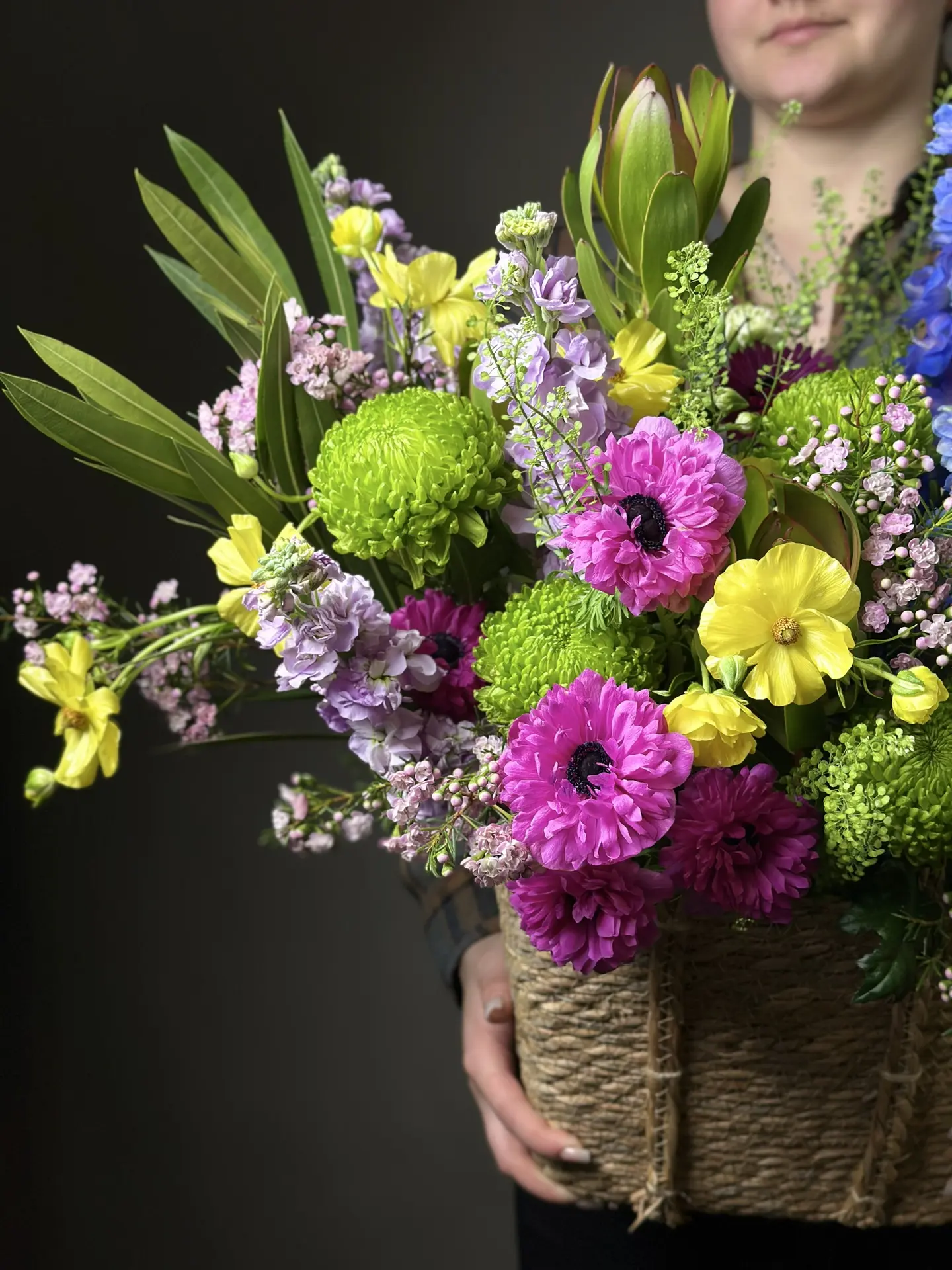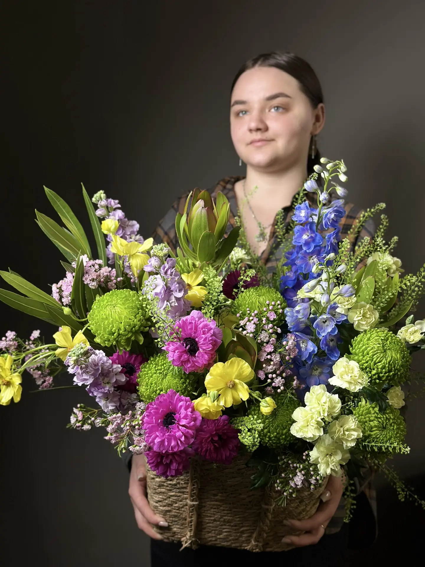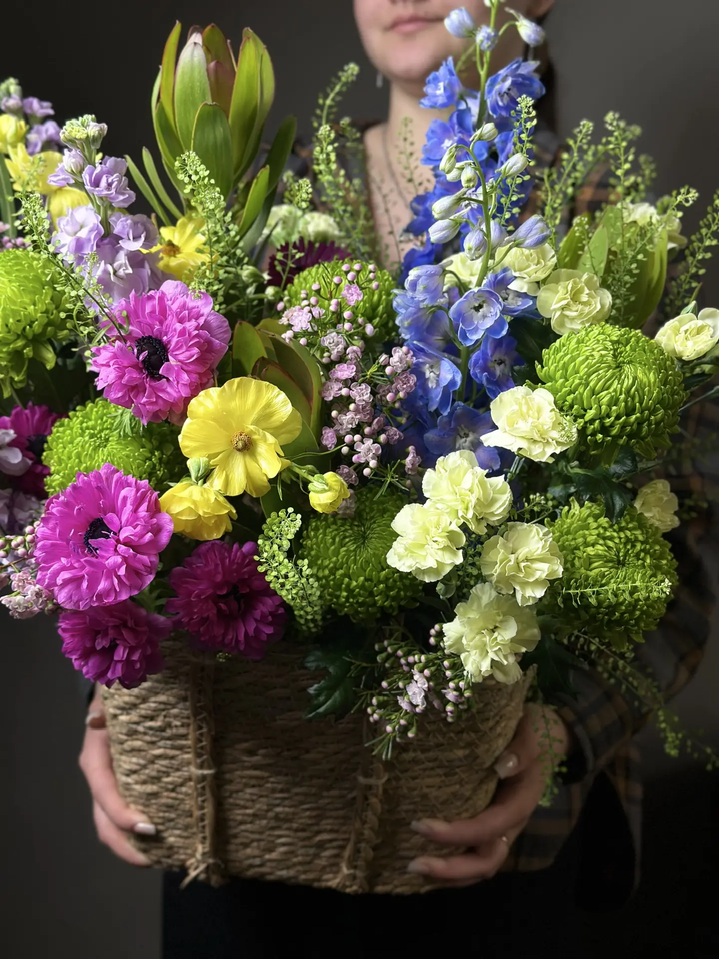 Букет «Дофамин» от бренда «Цветы Луны» — идеальный подарок близким и партнерам по любому поводу! Яркие эмоции гарантированы благодаря уникальному сочетанию гвоздик,ранункулюс, анемон, тласпи, маттиолы,хамелациум, хризантем, левкадендрон и дельфинария. Доставьте радость учителю, любимому человеку, родителям, друзьям или бизнес-партнёрам, оформив заказ этого волшебного подарка в стильной плетеной корзинке с бантом. Подходит ко всем праздникам: юбилеям, дням рождения, свадьбам, романтическим свиданиям и в качестве благодарности. Позвольте «Дофамину» подарить вам момент счастья — закажите цветы в корзине прямо сейчас!
