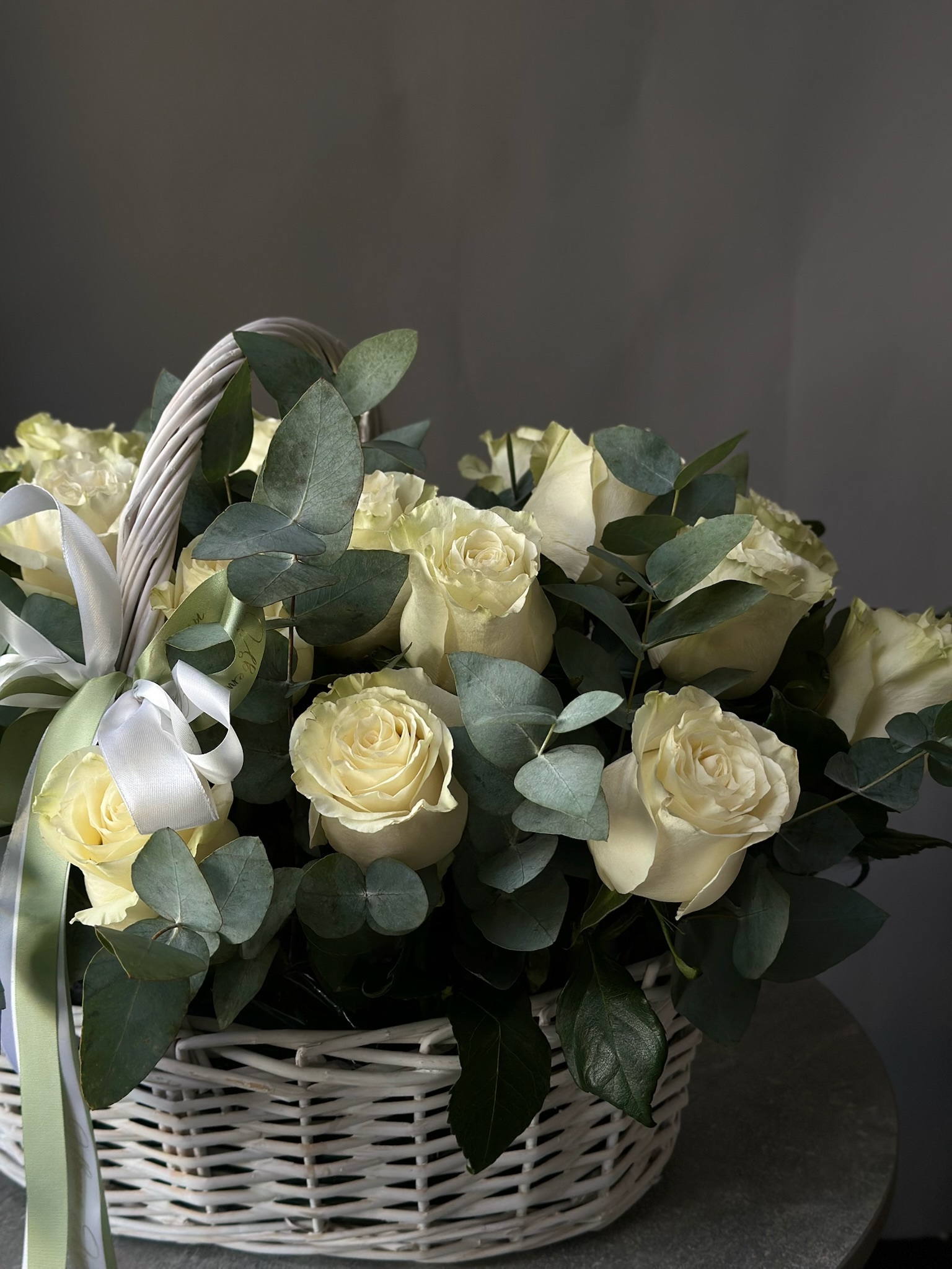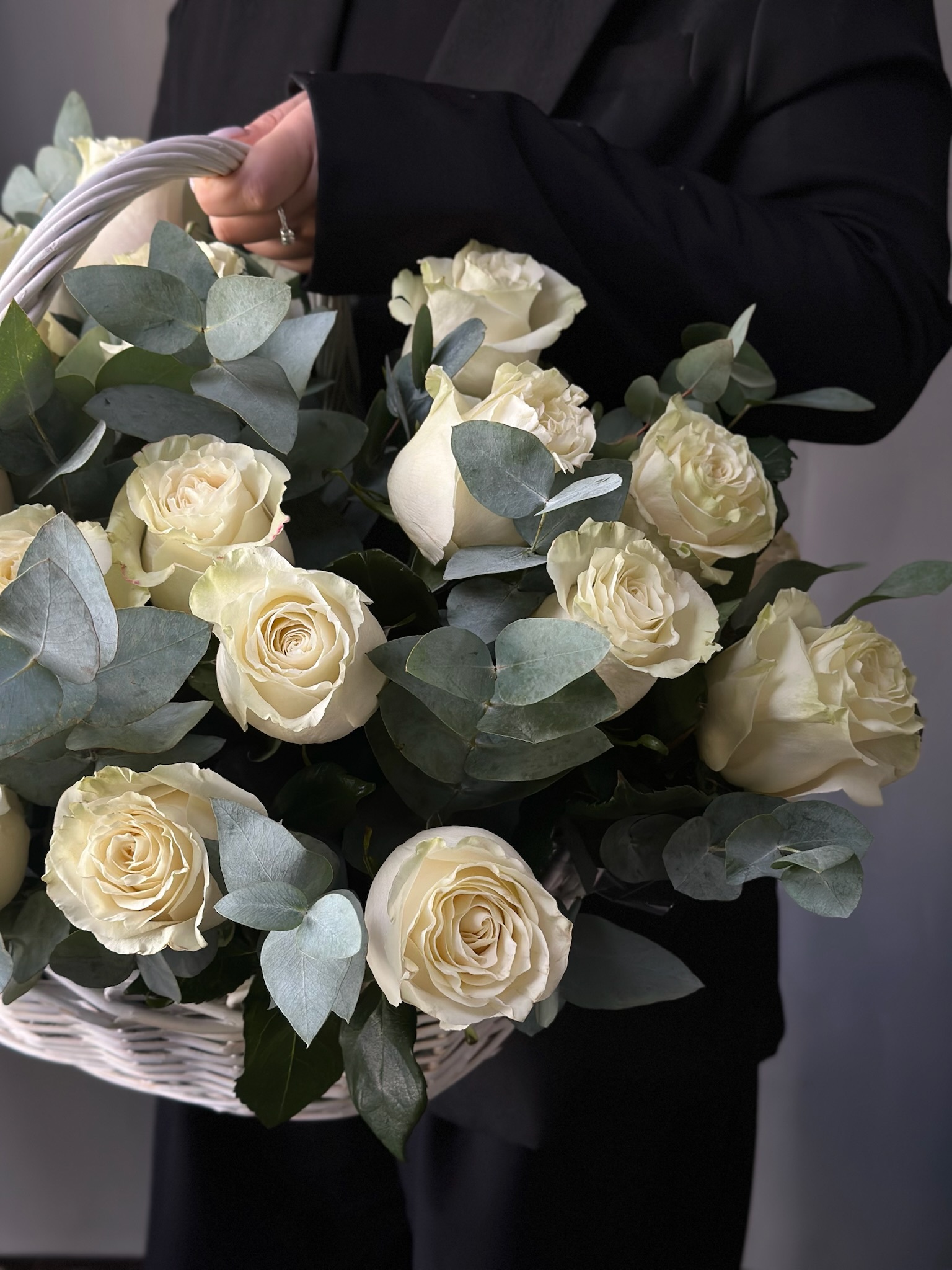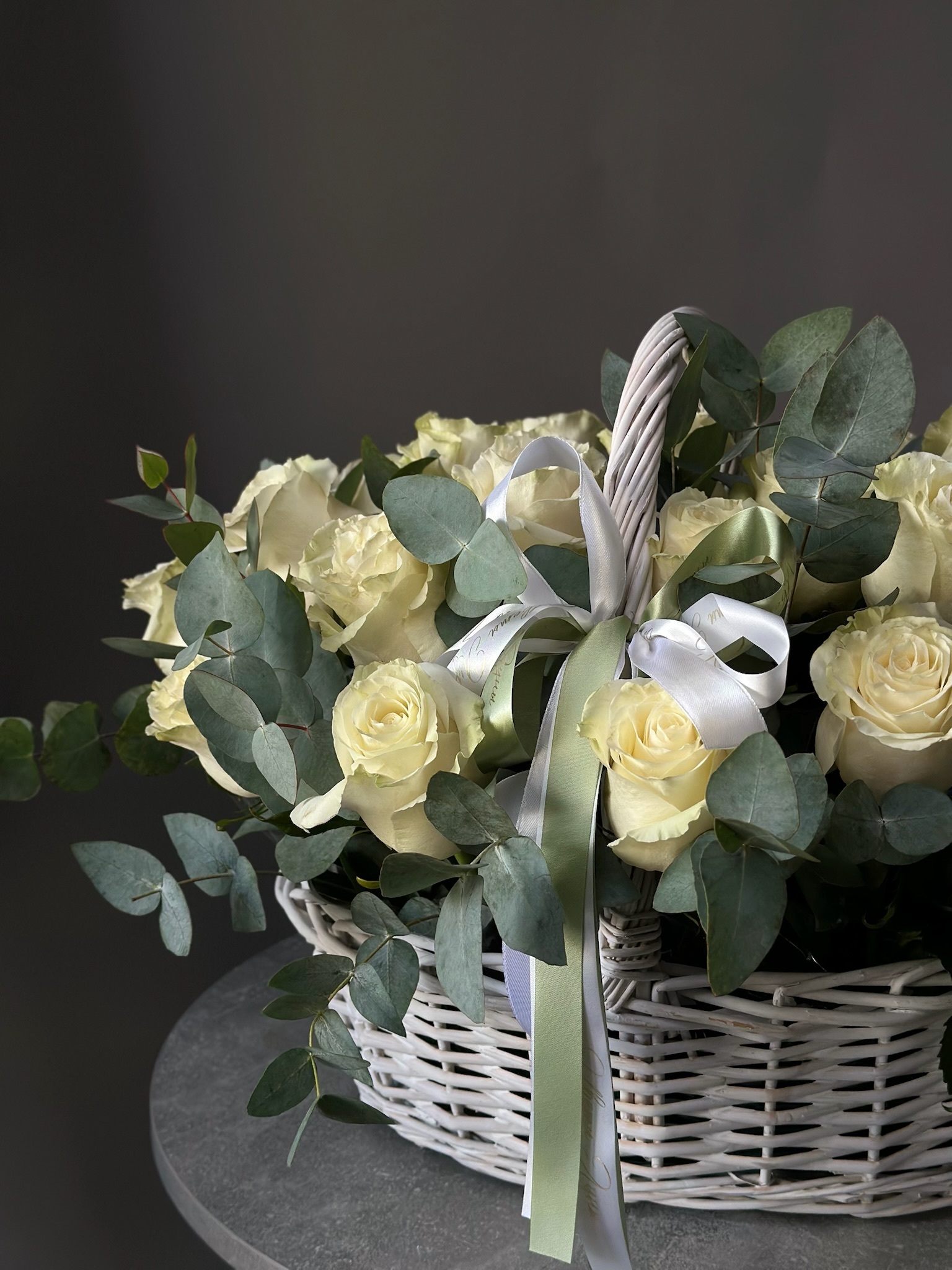 Прекрасные цветы в корзине «Мондиаль классик» от бренда "Цветы Луны" — идеальный подарок по любому поводу! Эвкалипт и роскошные белые розы подчеркнут вашу заботу о любимом человеке, учителе, бизнес-партнере либо близком родственнике. Удобная плетеная корзина и элегантный бант завершают композицию. Купить букет можно прямо сейчас в нашем магазине Саратова с быстрой доставкой. Курьер привезет свежайшие цветы прямо к двери!