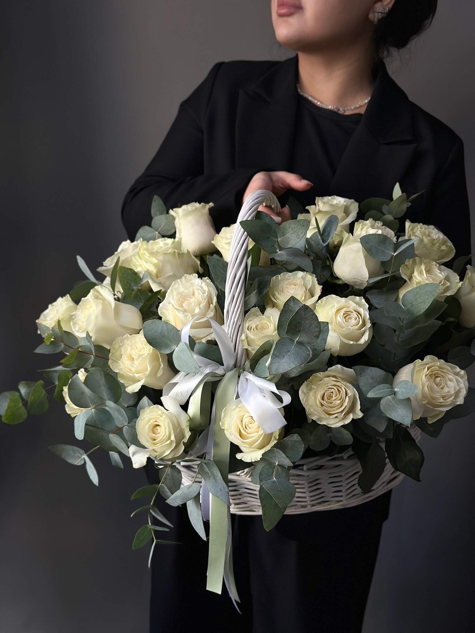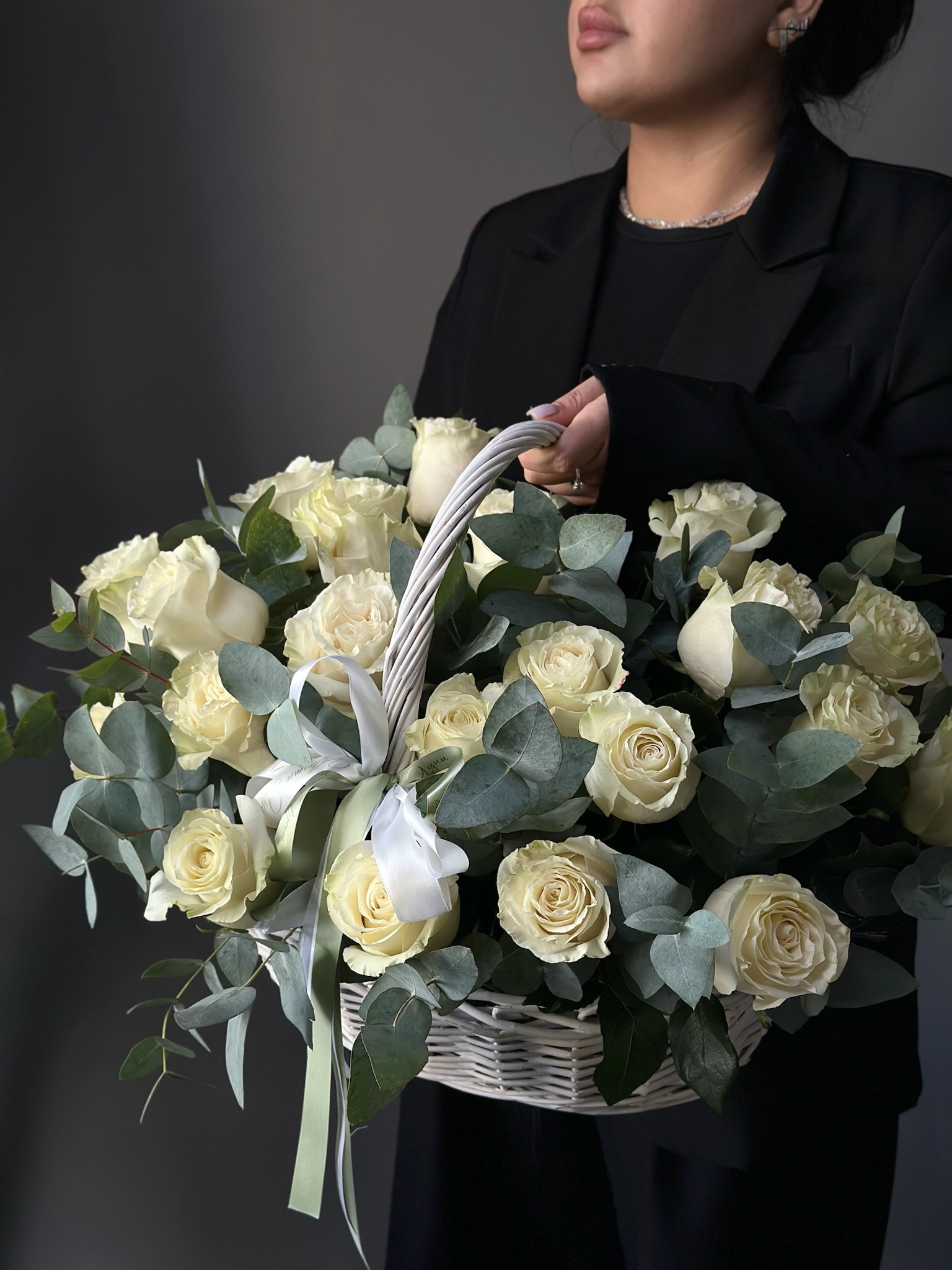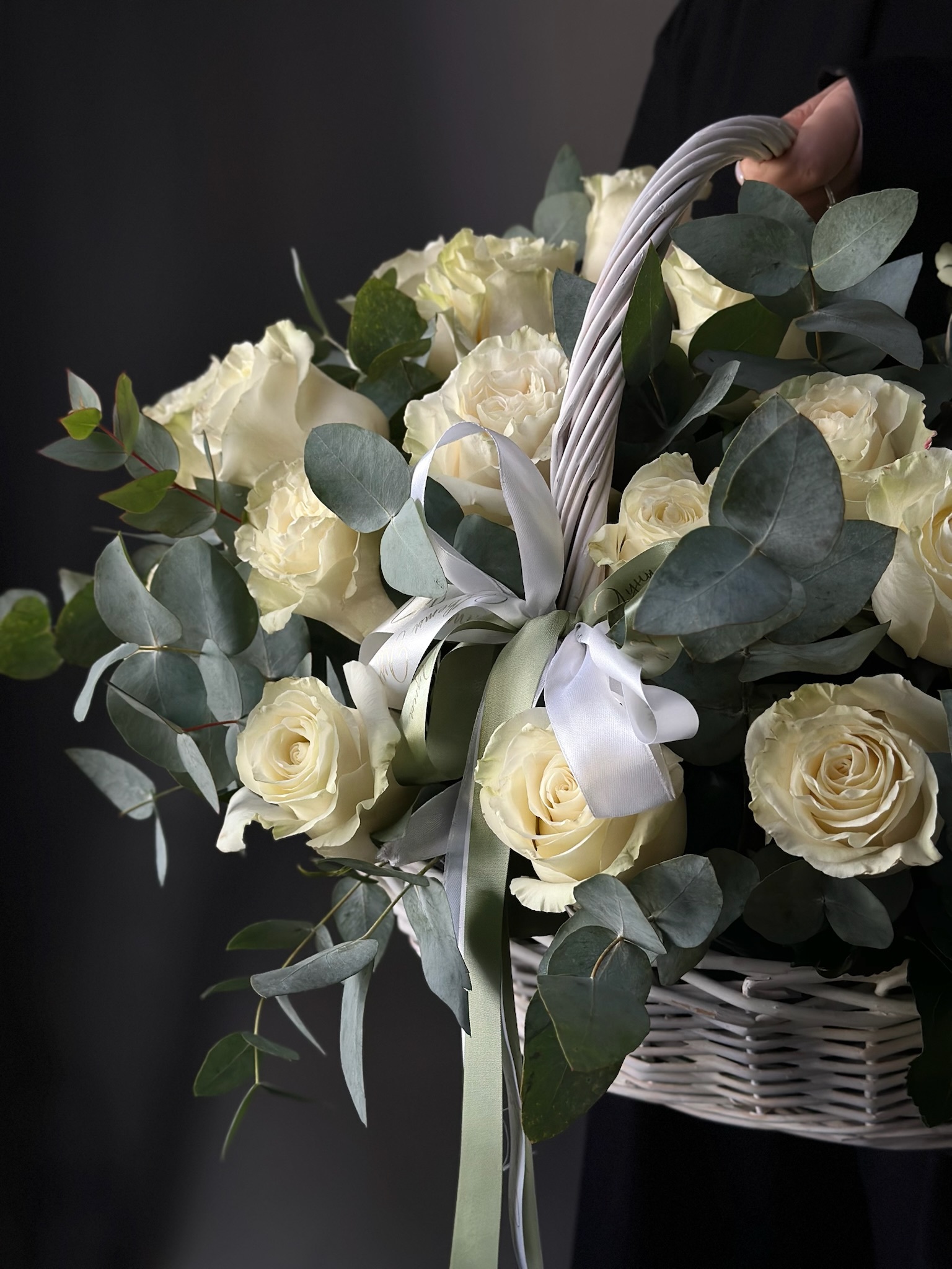 Прекрасные цветы в корзине «Мондиаль классик» от бренда "Цветы Луны" — идеальный подарок по любому поводу! Эвкалипт и роскошные белые розы подчеркнут вашу заботу о любимом человеке, учителе, бизнес-партнере либо близком родственнике. Удобная плетеная корзина и элегантный бант завершают композицию. Купить букет можно прямо сейчас в нашем магазине Саратова с быстрой доставкой. Курьер привезет свежайшие цветы прямо к двери!